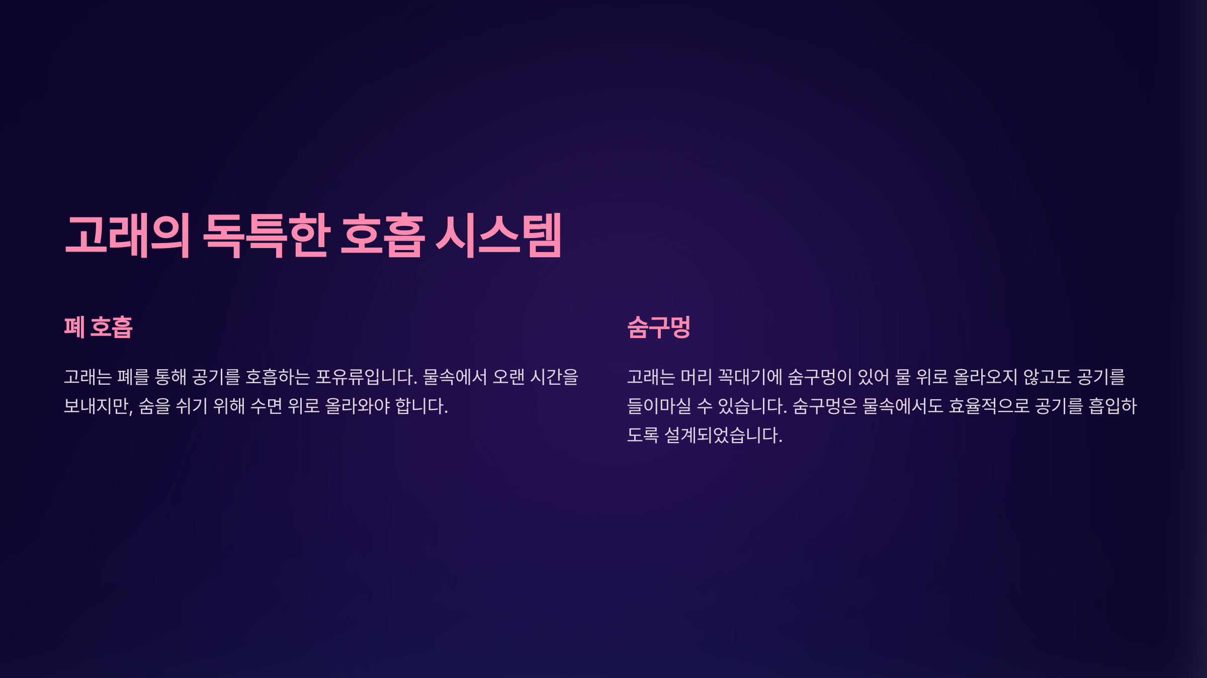 다음 섹션에서는 고래의 독특한 호흡 시스템에 대해 자세히 알아볼게요.