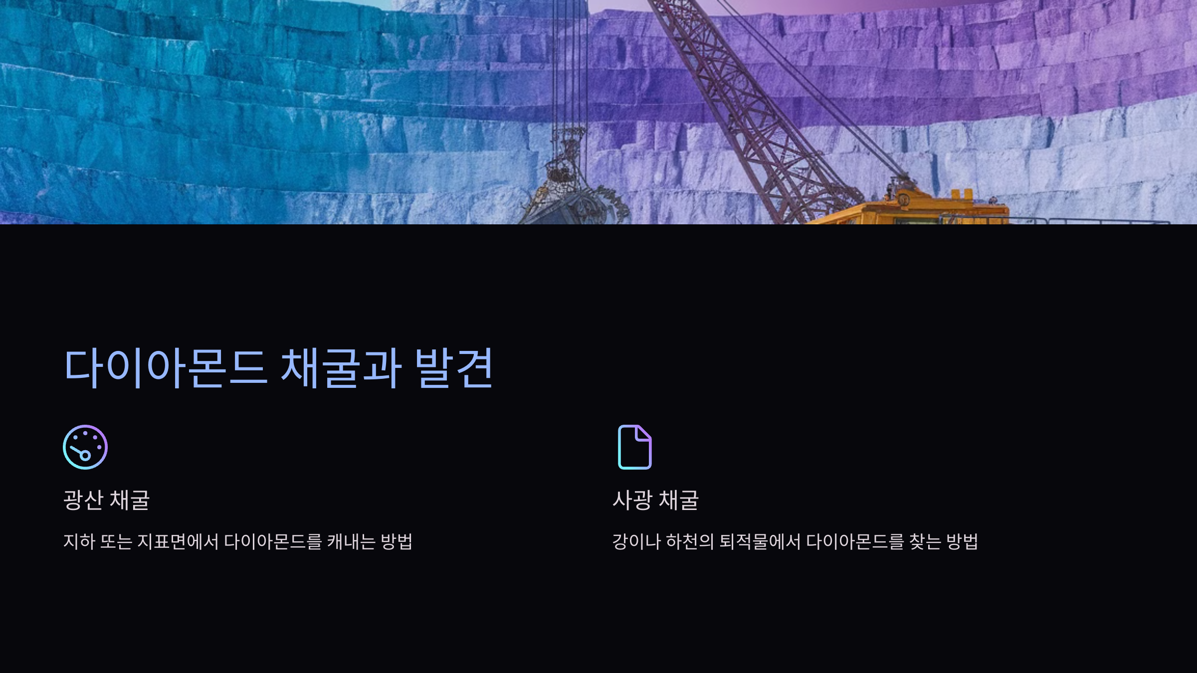 채굴은 크게 지하 채굴과 노천 채굴로 나뉘어요. 노천 채굴은 지표 가까이에 있는 다이아몬드를 찾기 위한 방법이고, 지하 채굴은 훨씬 더 깊은 곳에 있는 킴벌라이트 광맥에서 다이아몬드를 캐내는 방식이에요. 이러한 채굴은 고도의 기술과 장비가 필요해요.