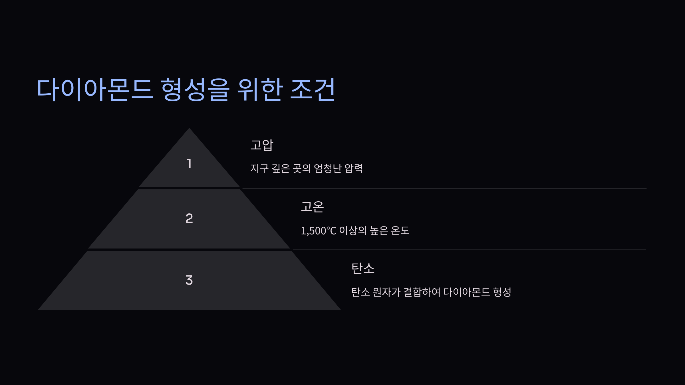 다이아몬드의 형성은 수십억 년이 걸릴 수 있어요. 과거 지구의 초기 환경에서는 맨틀에서 탄소가 고온·고압 상태로 안정된 다이아몬드 결정으로 바뀌기 쉬운 조건이었답니다. 이렇게 형성된 다이아몬드는 '킴벌라이트 파이프'라는 화산암 구조를 통해 지표로 이동하게 돼요.