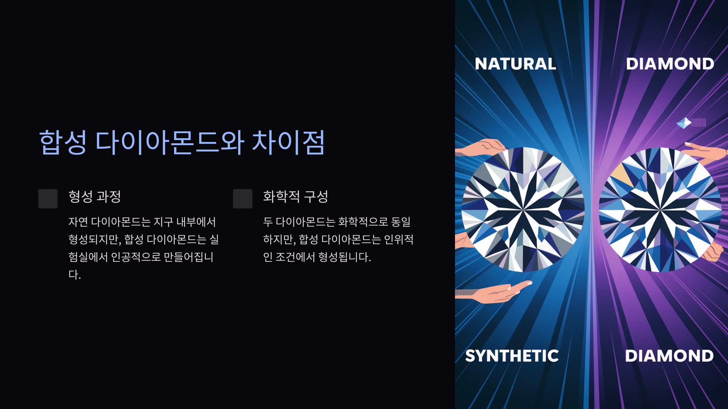 합성 다이아몬드는 천연 다이아몬드와 물리적, 화학적 특성이 거의 동일해요. 하지만 과학적 장비를 사용하면 두 종류를 구분할 수 있어요. 예를 들어, 합성 다이아몬드는 천연 다이아몬드보다 불순물이 적고, 내부 구조가 다소 균일한 특징이 있답니다.