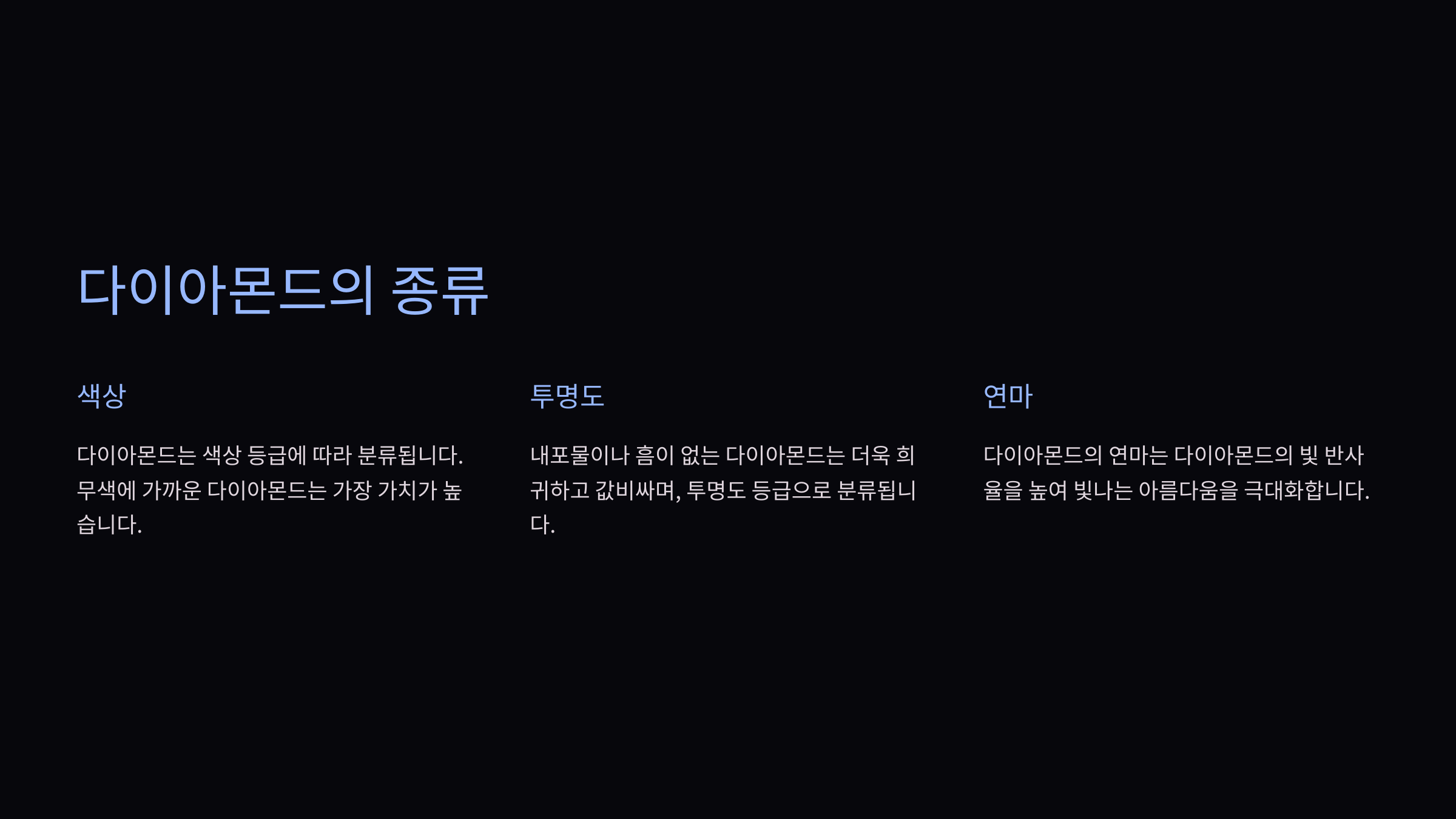 또한, 다이아몬드는 보석용으로 사용되기도 하지만, 산업용으로도 중요한 가치를 지니고 있어요. 산업용 다이아몬드는 주로 절단 도구나 연마재로 사용되며, 그 경도와 내구성이 큰 역할을 한답니다.