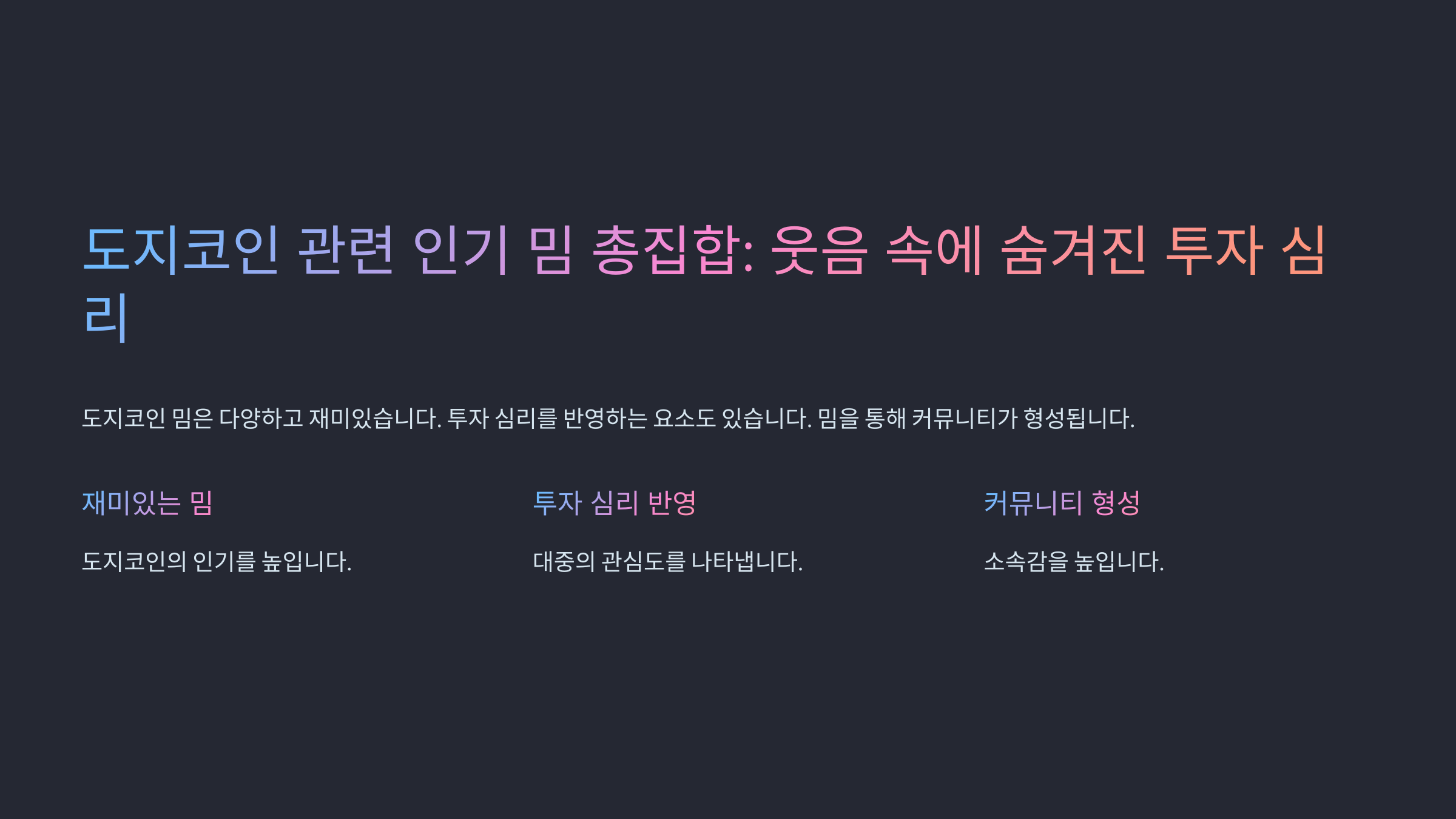 도지코인 커뮤니티는 재치 넘치는 밈으로 유명해요. 그중 몇 가지 대표적인 밈을 소개할게요! 😎