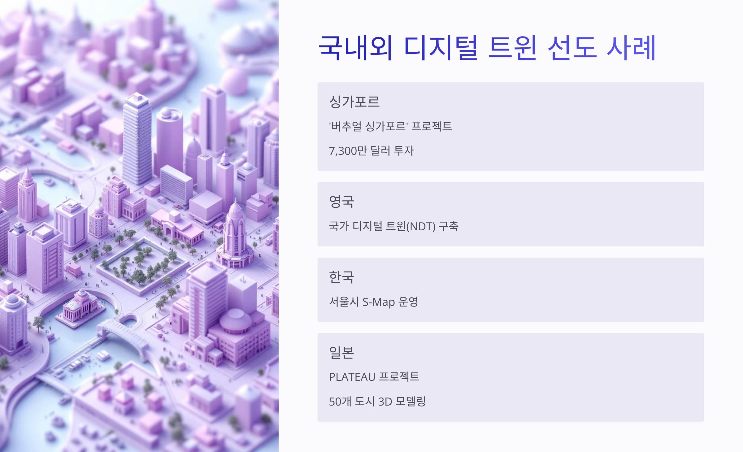| 싱가포르 | 스마트시티 전환 | 국가 차원의 디지털 트윈 플랫폼 운영 |