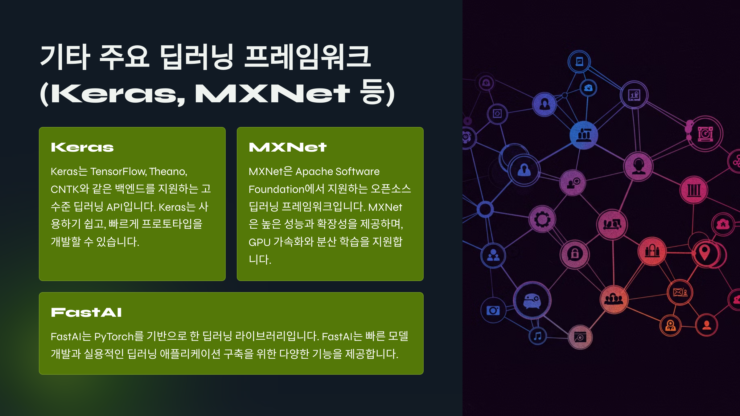 PyTorch는 연구 및 실험에 적합하며, 코드가 직관적이라 배우기 쉬워요! 하지만 산업용 배포에서는 TensorFlow가 더 유리할 수도 있어요. 이제 기타 주요 딥러닝 프레임워크를 살펴볼까요? 🤖