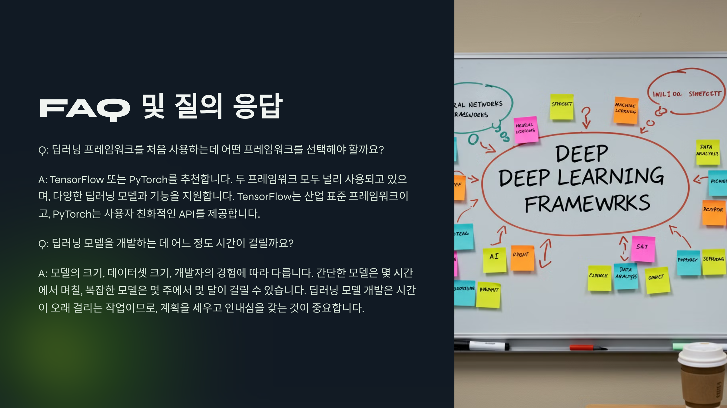 각 프레임워크마다 장점이 있으므로, 프로젝트 성격에 따라 적절한 프레임워크를 선택하는 것이 좋아요! 📊 이제 딥러닝 프레임워크 관련 자주 묻는 질문(FAQ)을 살펴볼까요? ❓