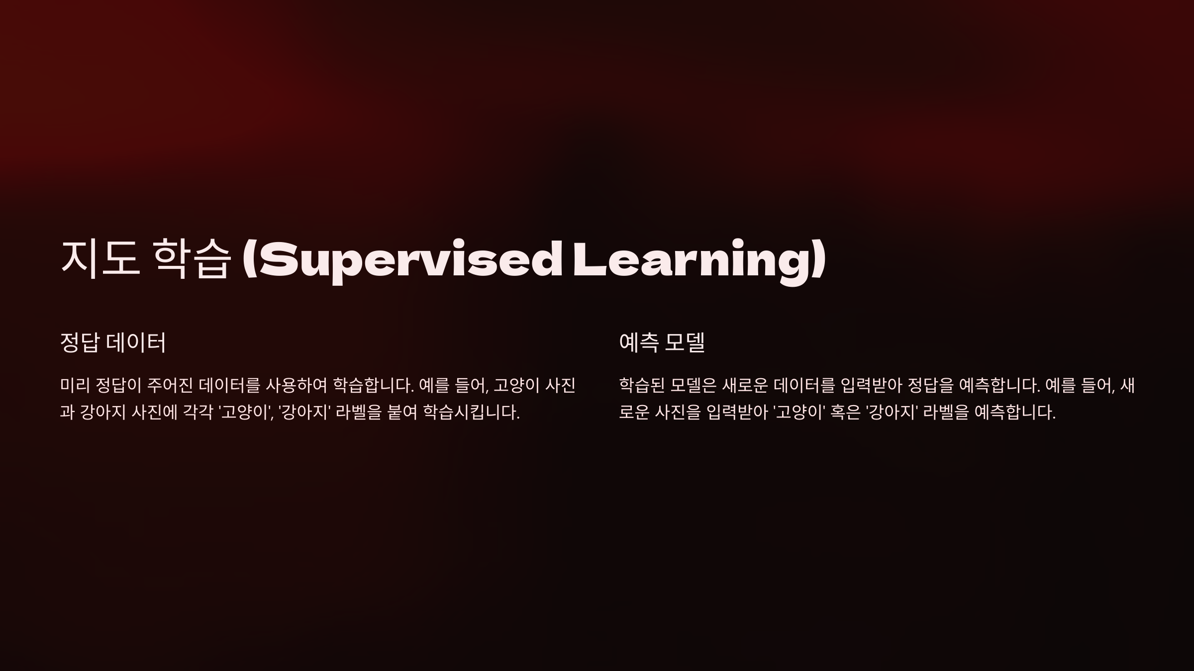 - ✅ **입력과 정답(출력)이 존재** – 모델이 데이터를 학습하여 패턴을 찾아요.