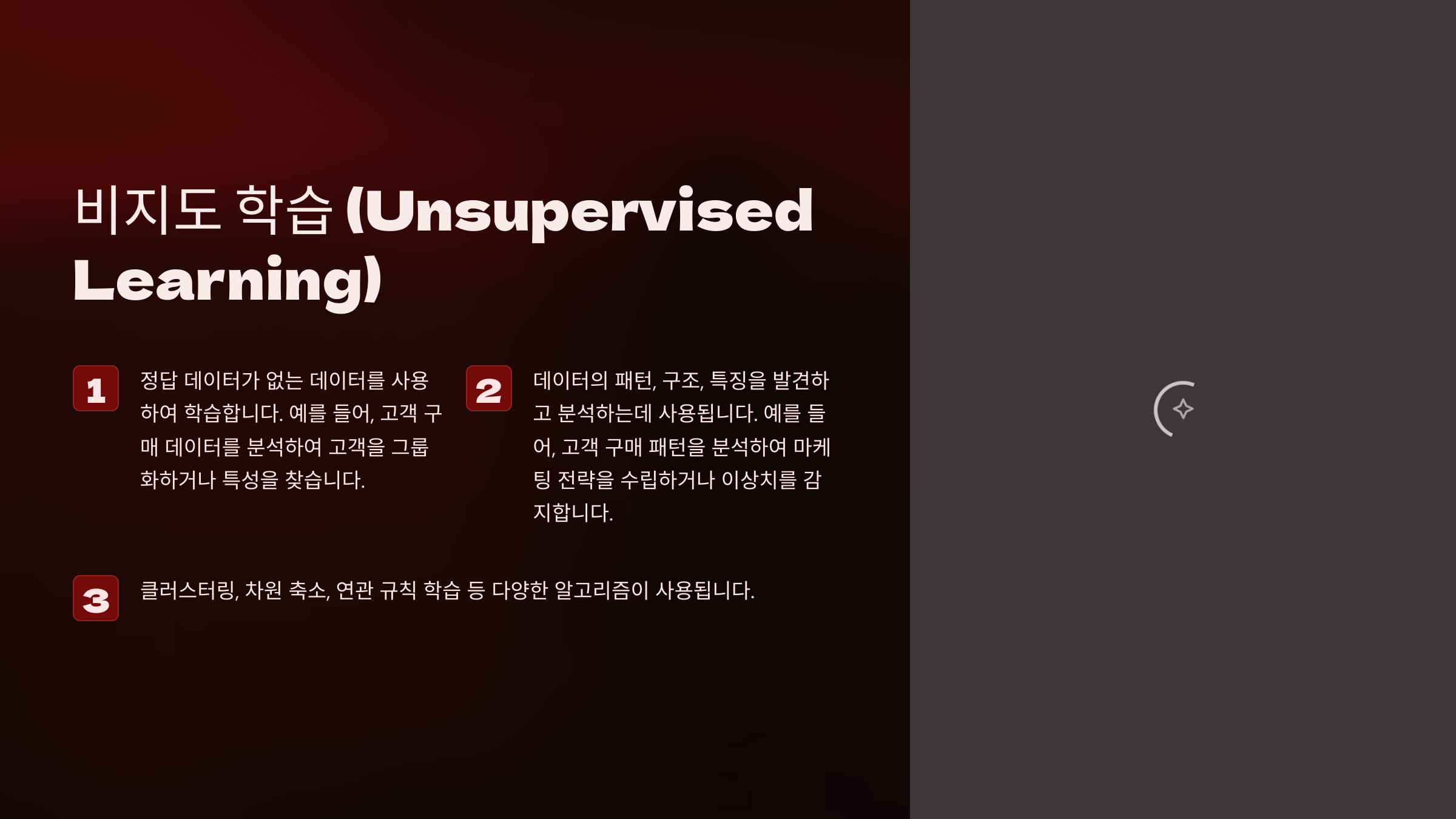 - ❌ **정답(레이블)이 없는 데이터 사용** – 모델이 스스로 패턴을 찾아요.