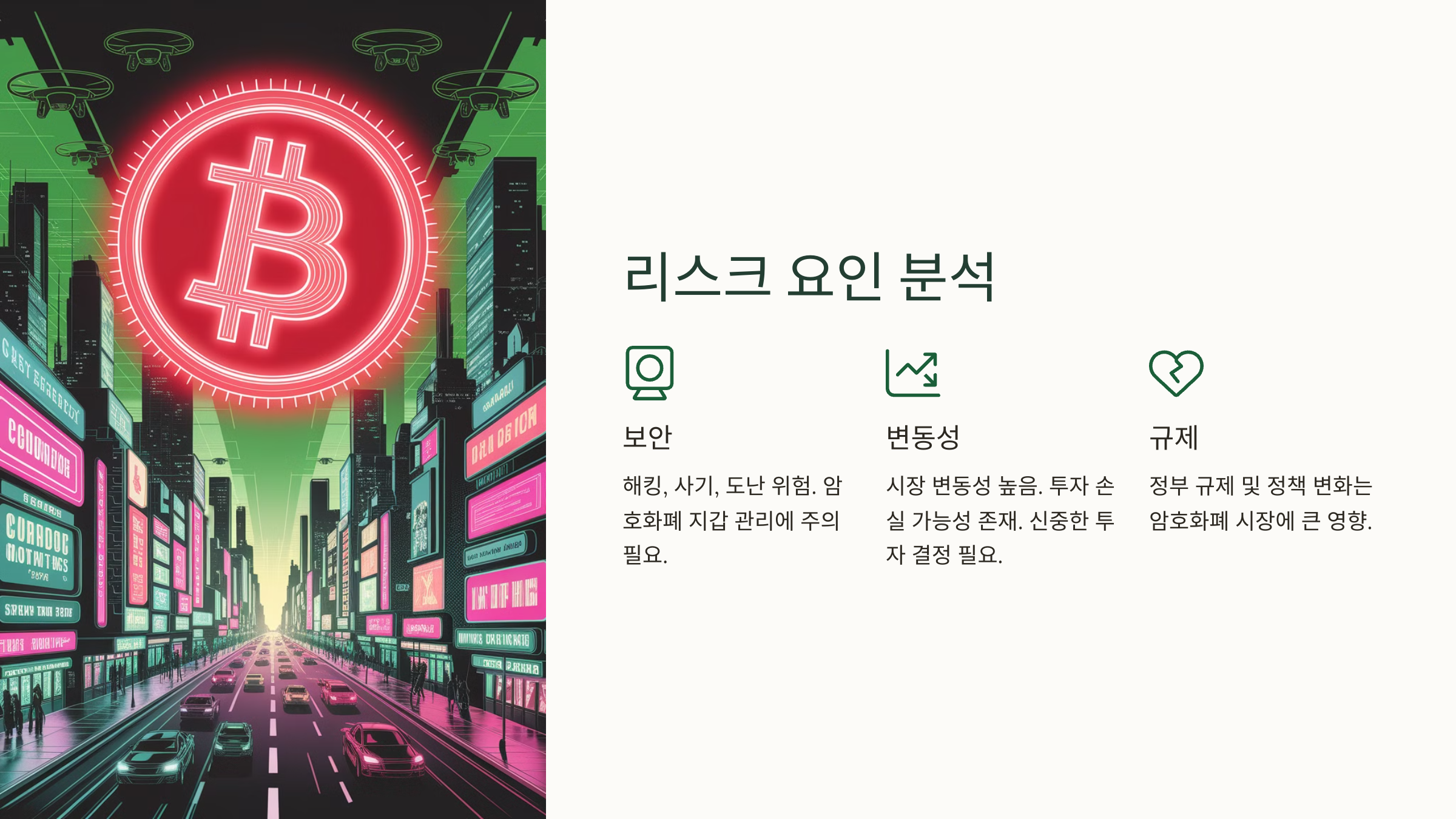 비트코인의 주요 리스크는 정부 규제와 채굴 난이도 증가예요. 각국 정부가 비트코인을 법적으로 제한하거나 세금 규제를 강화하면, 기관 투자자들의 유입이 줄어들 가능성이 있어요. 또한, 비트코인은 채굴 난이도가 지속적으로 증가하면서 네트워크 유지 비용이 높아지는 문제도 있어요.