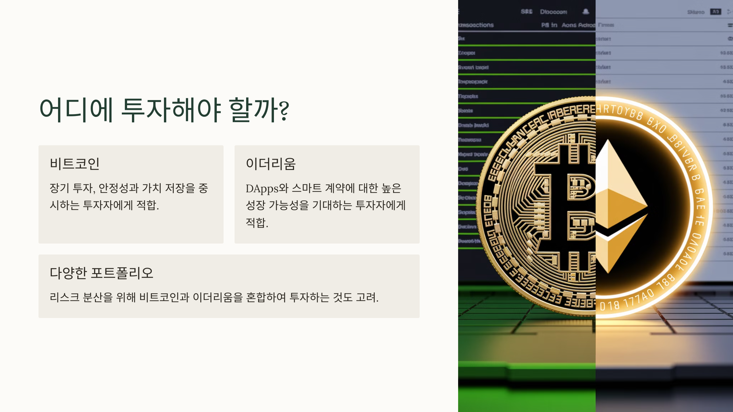 비트코인과 이더리움 중 어디에 투자할지 고민된다면, 투자 목적과 리스크 선호도를 고려해야 해요. 두 코인은 각각 다른 성격을 가지고 있기 때문에, 투자 전략도 다르게 접근하는 것이 좋아요.