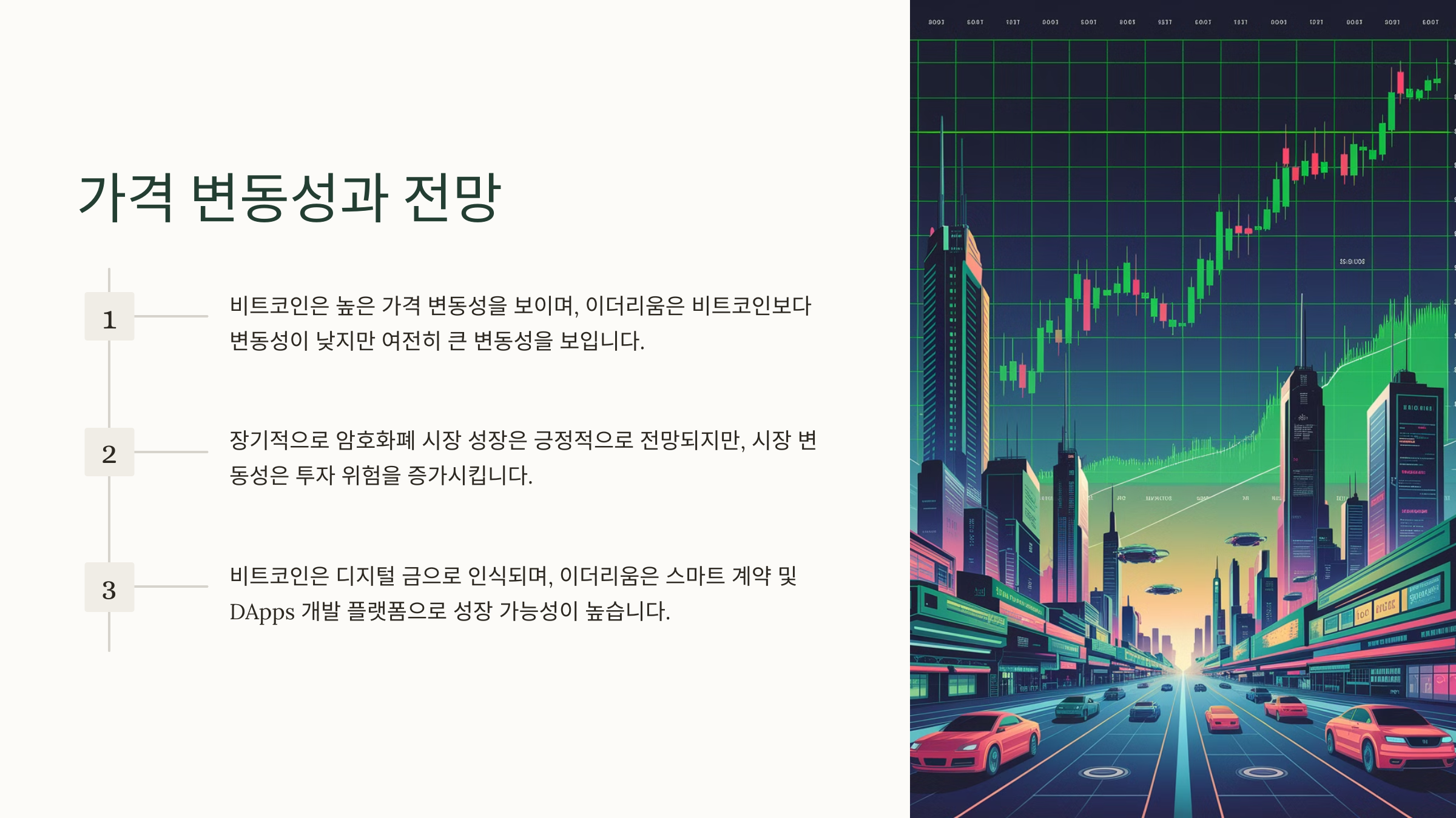위의 표를 보면, 비트코인은 보안성과 희소성에 집중하는 반면, 이더리움은 확장성과 기능성에 초점을 맞추고 있어요. 이 차이 때문에 두 코인은 가격 변동성과 향후 성장 가능성에서도 다른 패턴을 보이게 돼요. 📊