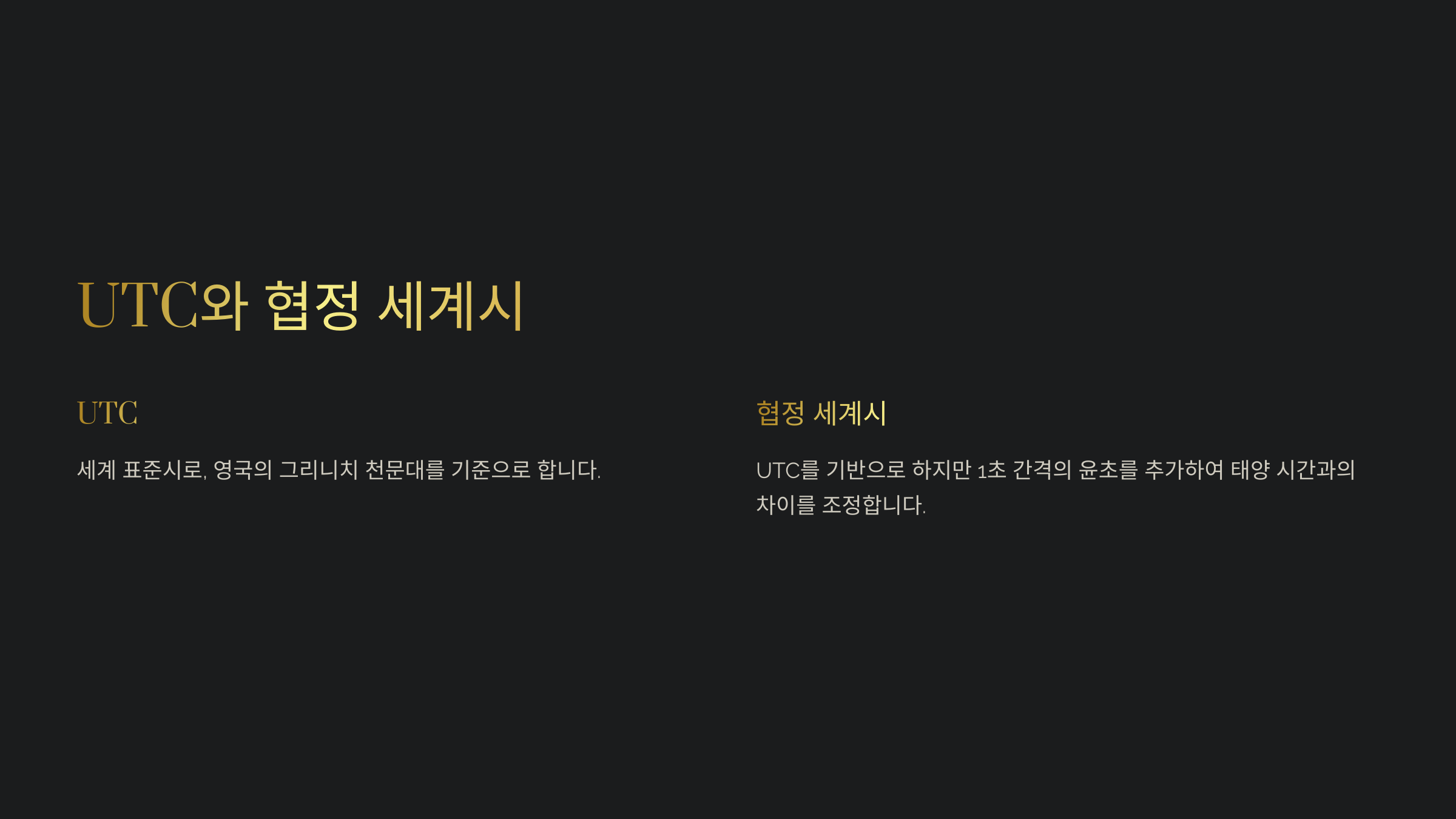협정 세계시(UTC)는 전 세계 시간의 기준이 되는 시간 체계예요. UTC는 원자시계와 지구의 자전을 기반으로 정의된 시간으로, 국제적인 통일성을 유지하기 위해 사용돼요. 쉽게 말해, UTC는 전 세계가 같은 시간을 공유할 수 있도록 만든 시스템이에요.