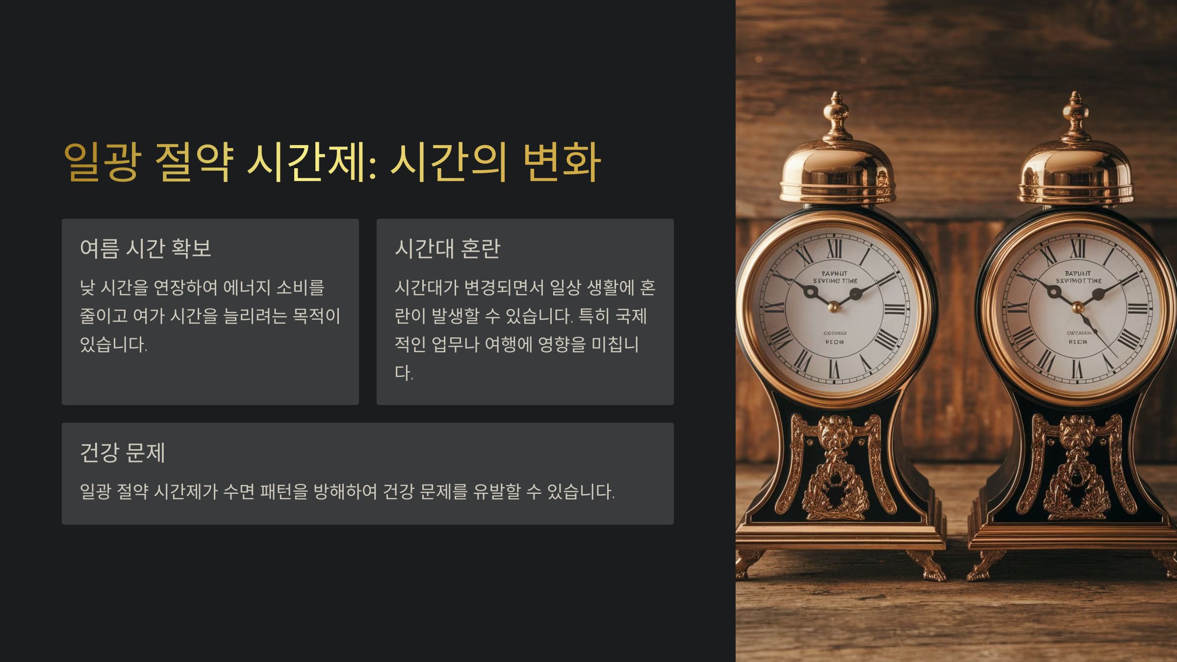 일광 절약 시간제(Daylight Saving Time, DST)는 여름철에 낮 시간을 더 효율적으로 활용하기 위해 시계를 1시간 앞당기는 제도예요. 이 제도는 에너지 절약과 생산성 향상을 목적으로 처음 도입되었답니다.
