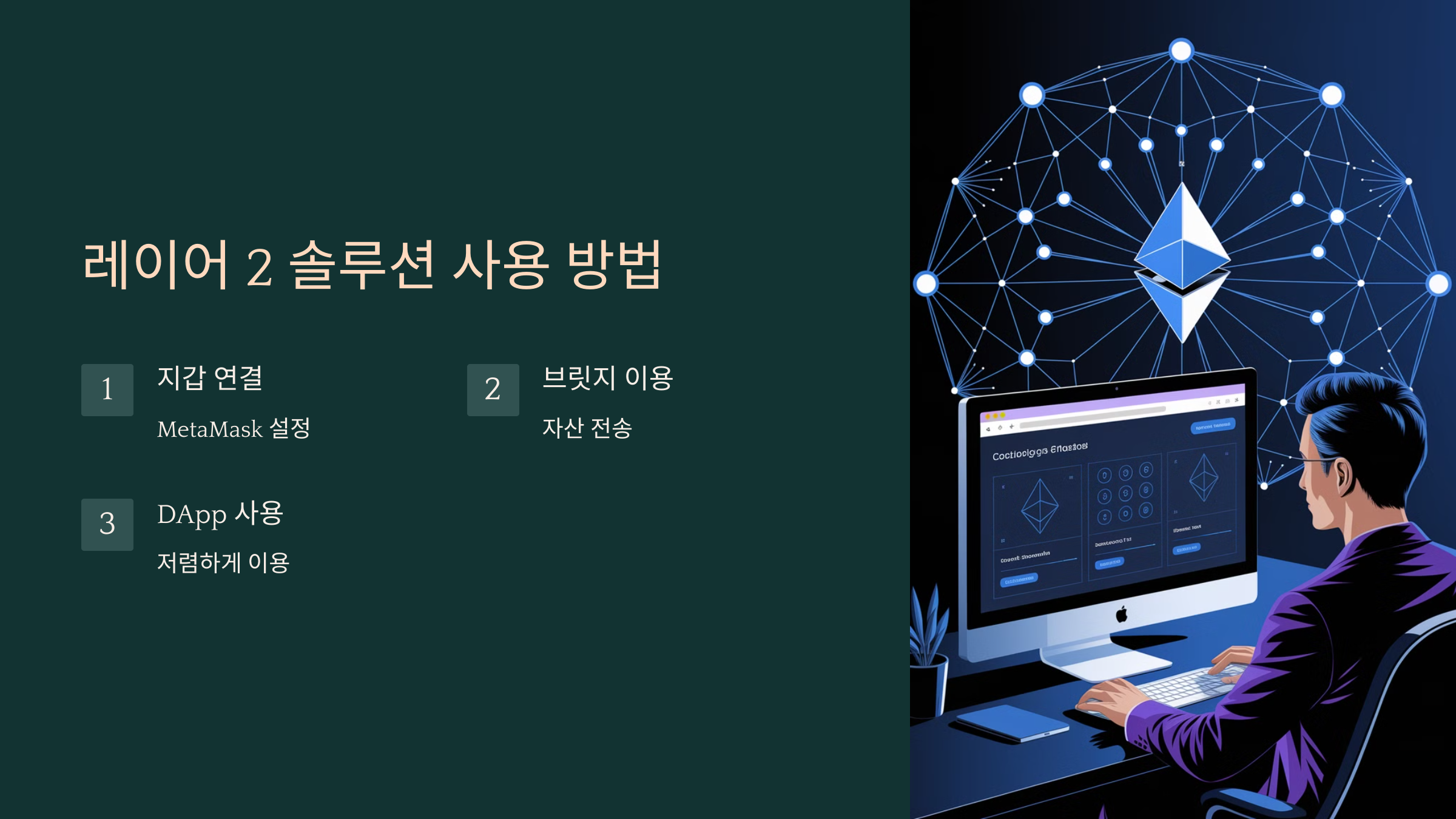레이어 2 솔루션을 사용하려면 먼저 이더리움 지갑(예: 메타마스크)을 레이어 2 네트워크에 연결해야 해요. 이후 레이어 2 지원 디앱에 접속하여 거래를 진행하면 돼요.
