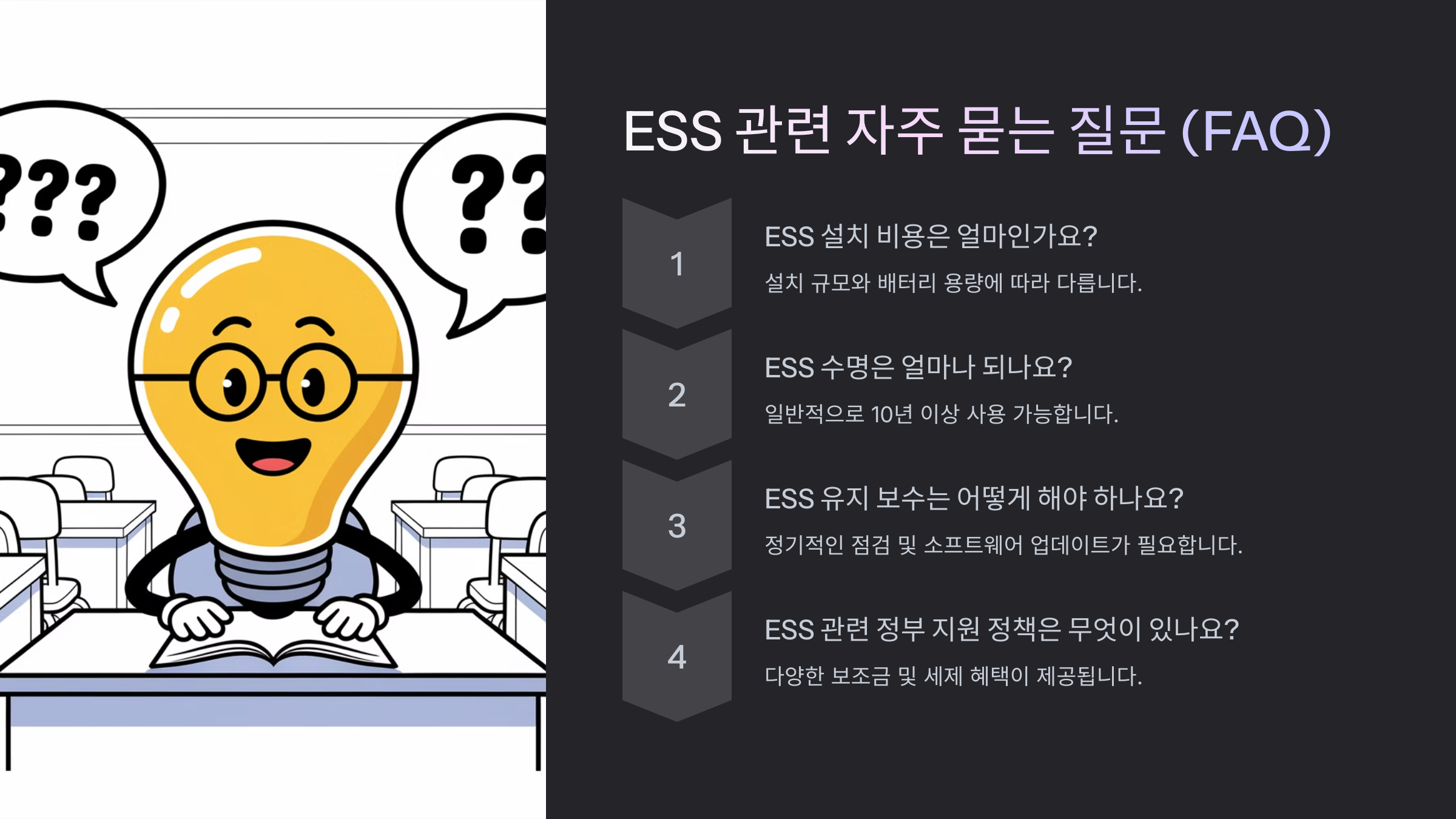 A1. **태양광과 함께 설치**하면 충분히 가능해요. **낮에 충전한 전기를 밤에 사용**하며, **남는 전기는 판매할 수도 있어요.** ☀️🔋