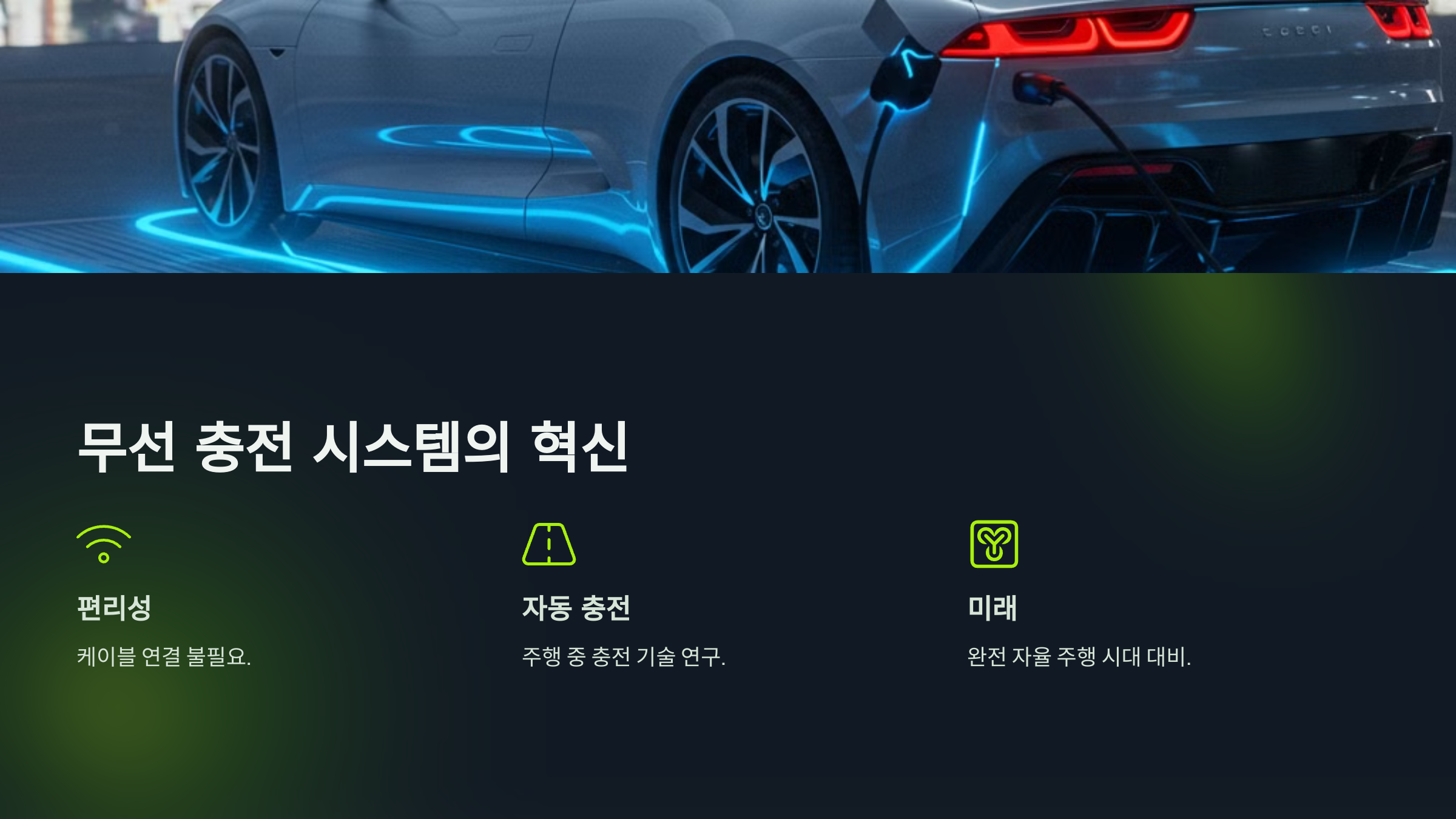 - 📡 무선 충전: 별도의 케이블 없이 충전할 수 있는 기술로, 주차장이나 도로에 충전 패드를 설치해 주행 중 충전이 가능하도록 연구 중이에요.