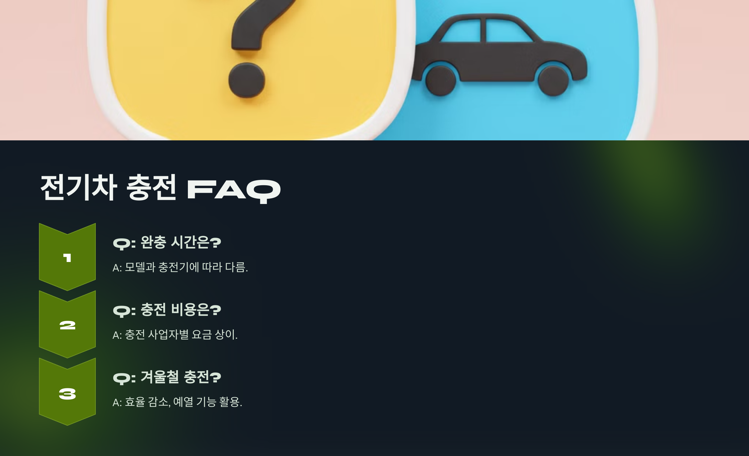 A7. 전 세계적으로 충전 인프라가 빠르게 확장되고 있어요. 한국에서도 2025년까지 50만 개 이상의 충전소를 설치할 계획이에요. 🔌