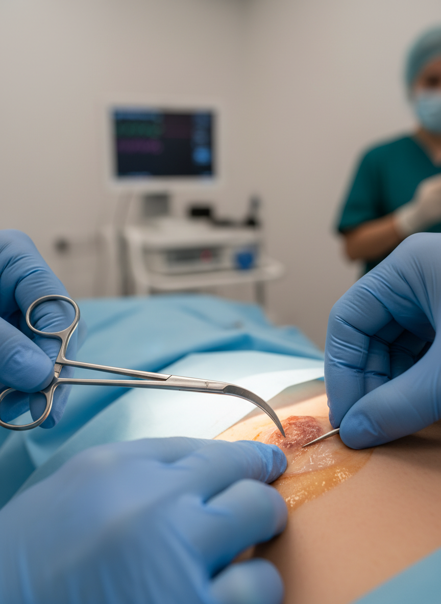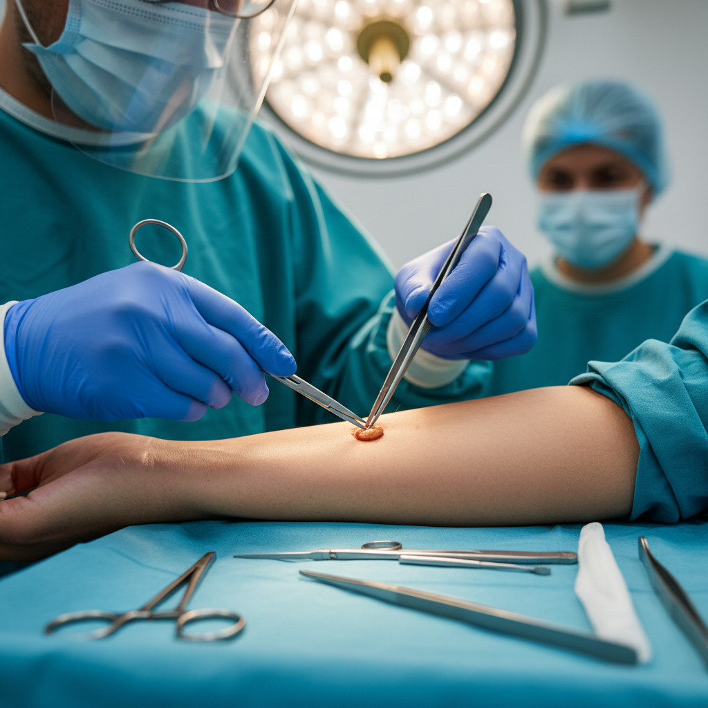 크기가 크거나 뿌리가 깊은 쥐젖의 경우, 메스나 가위를 이용해 외과적으로 절제하는 방법을 사용합니다. 이 경우 봉합이 필요할 수도 있으며, 조직 검사를 통해 다른 피부 질환과의 감별이 필요한 경우에도 활용됩니다.