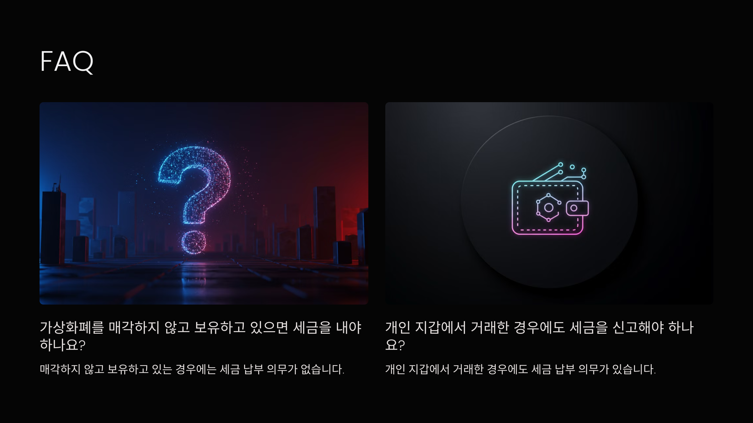 ✔️ **양도소득세:** 가상화폐를 매도할 때 발생하는 이익에 대한 세금