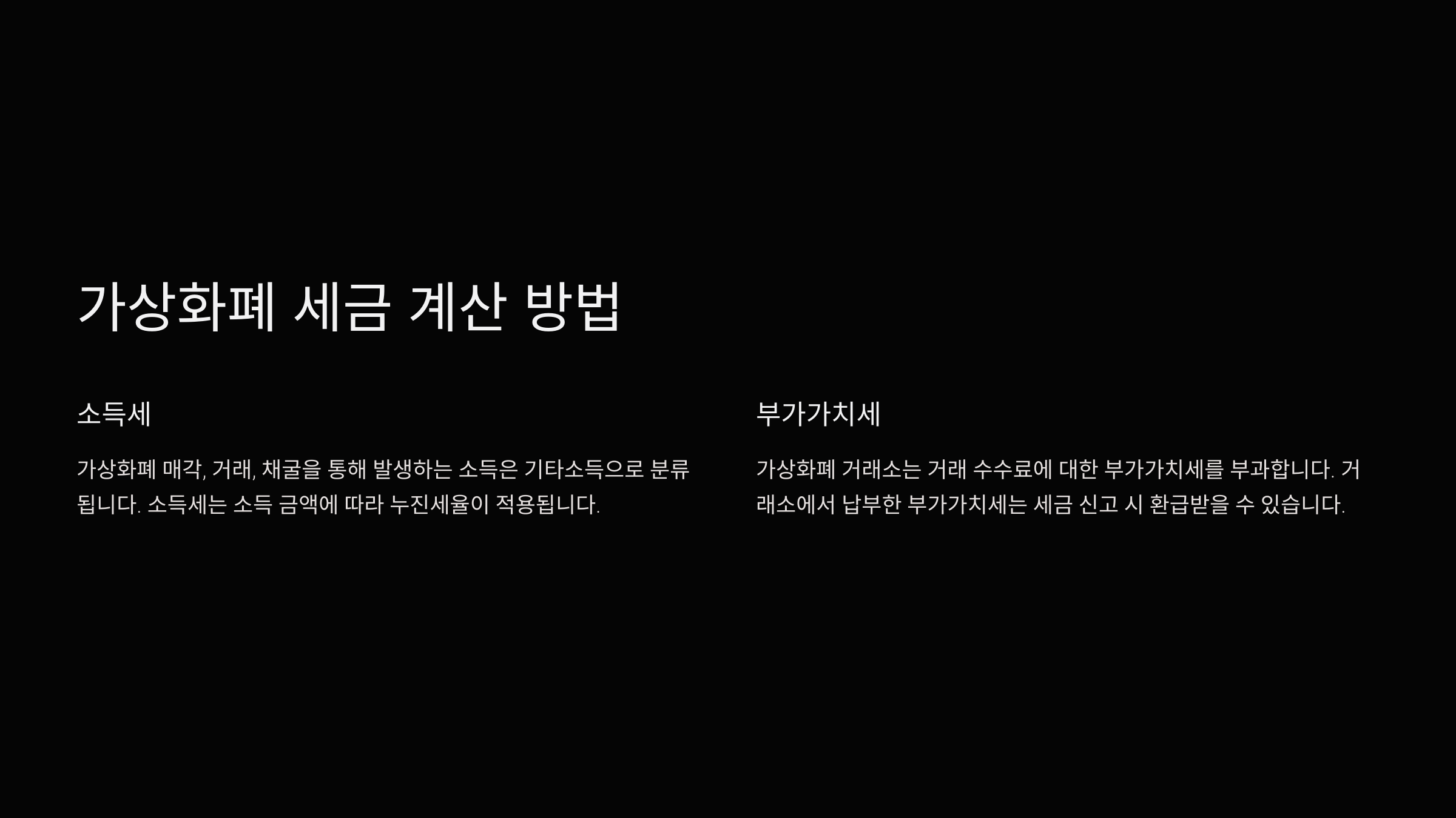 ✔️ **부가가치세(VAT):** 일부 국가에서는 가상화폐 거래에도 부가가치세를 부과해요.