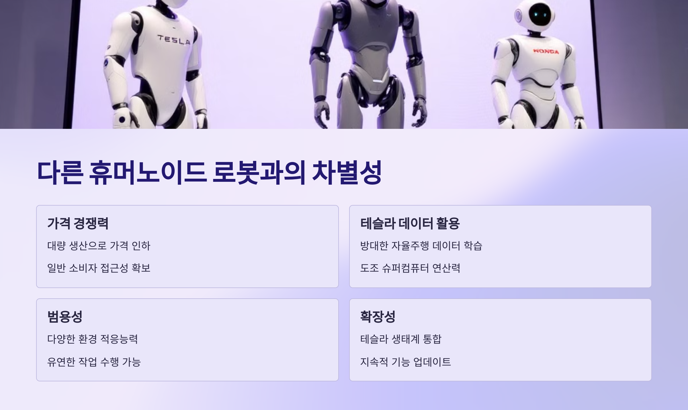 | 옵티머스 | 테슬라 | 생활, 산업 작업 | 자율학습, 실시간 대응 | 2025년 이후 목표 |