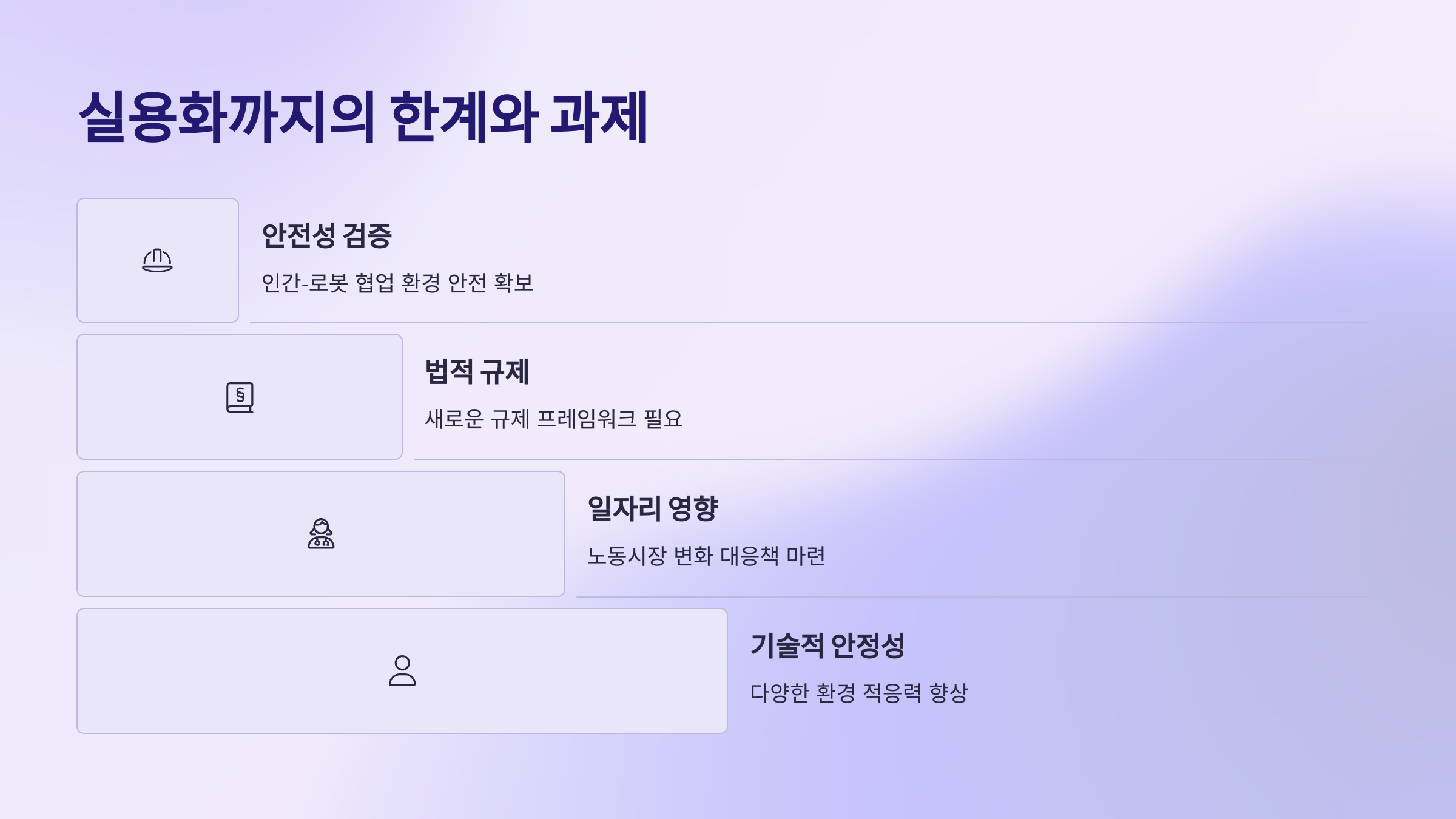 | 사회적 수용 | 로봇에 대한 거부감, 신뢰 부족 |