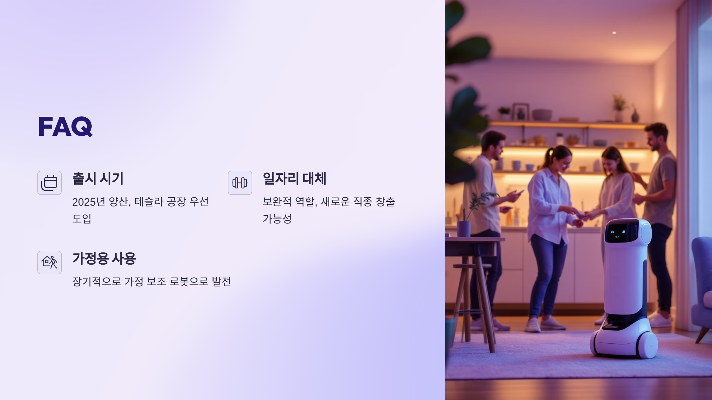 A6. 머스크는 장기적으로 각 가정에 한 대씩 보급하는 걸 목표로 하고 있어요. 청소, 정리, 돌봄 보조 등의 역할이 가능할 수 있어요.