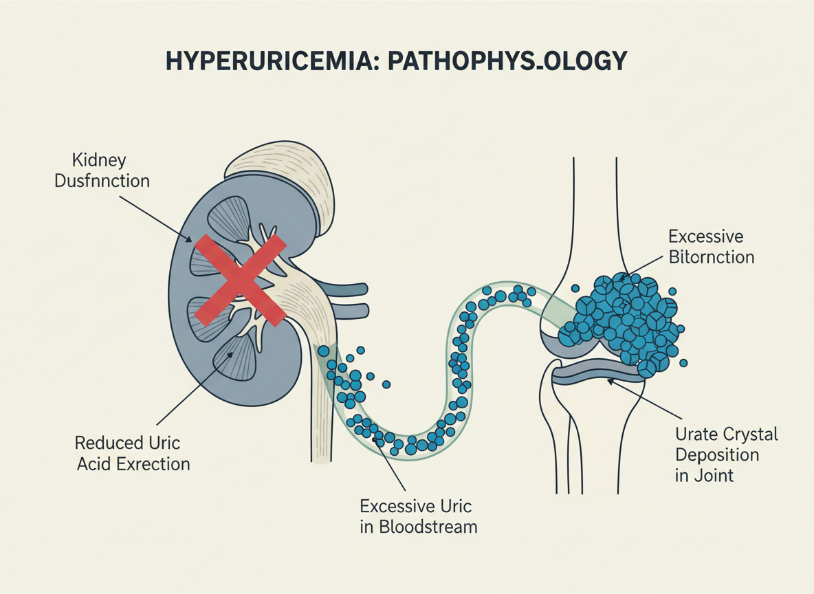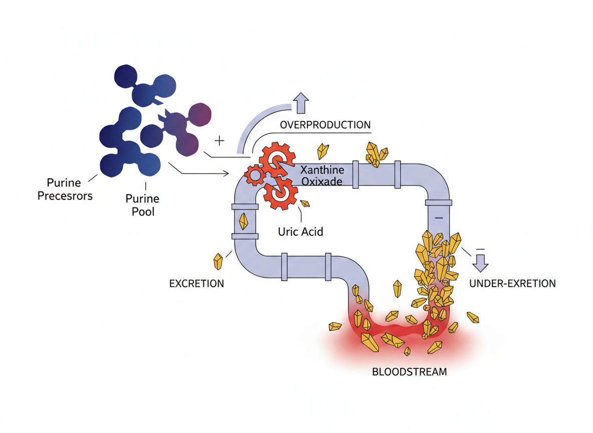 통풍의 주범은 바로 ‘요산(Uric acid)’입니다. 우리 몸에는 퓨린이라는 물질이 있는데, 이것이 대사되는 과정에서 요산이 생성돼요. 보통은 이 요산이 신장을 통해 소변으로 배출되는데, 만약 몸속에 요산이 너무 많이 쌓이거나 신장에서 제대로 배출되지 못하면 어떻게 될까요? 네, 맞아요. 요산 수치가 높아지면서 바늘 같은 요산 결정체가 관절이나 다른 조직에 침착하게 됩니다. 이게 바로 통풍 발작의 원인이 되는 거죠.