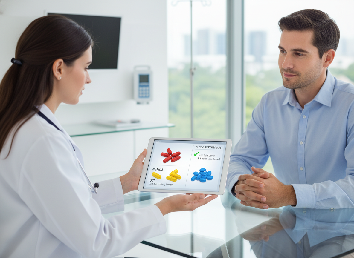 3. 만성 관리의 핵심은 요산 저하제: 알로푸리놀, 페북소스타트 등으로 요산 수치를 꾸준히 조절해야 해요.