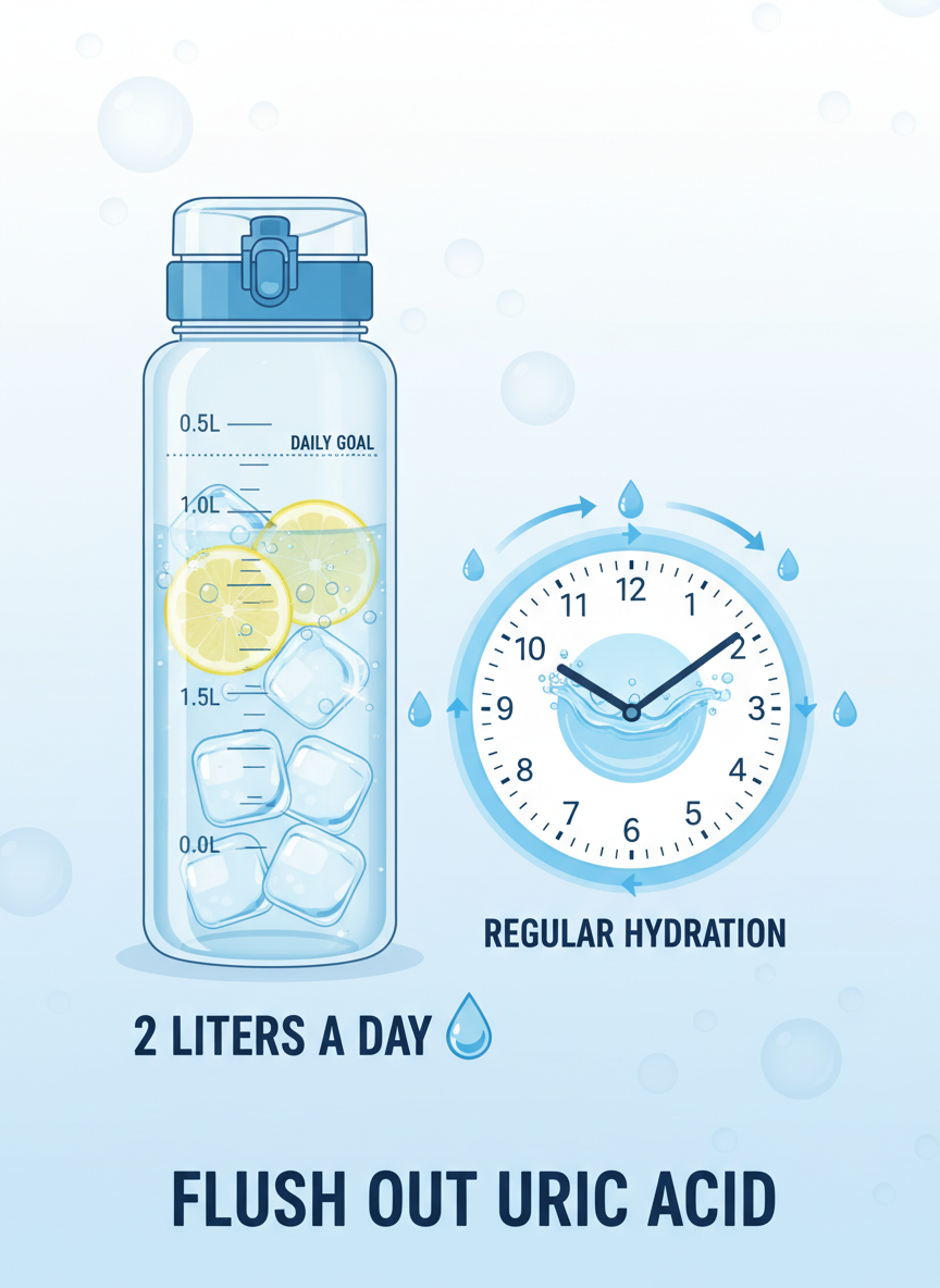 - 충분한 수분 섭취: 하루 2리터 이상의 물을 마셔서 요산이 원활하게 배출되도록 돕습니다.