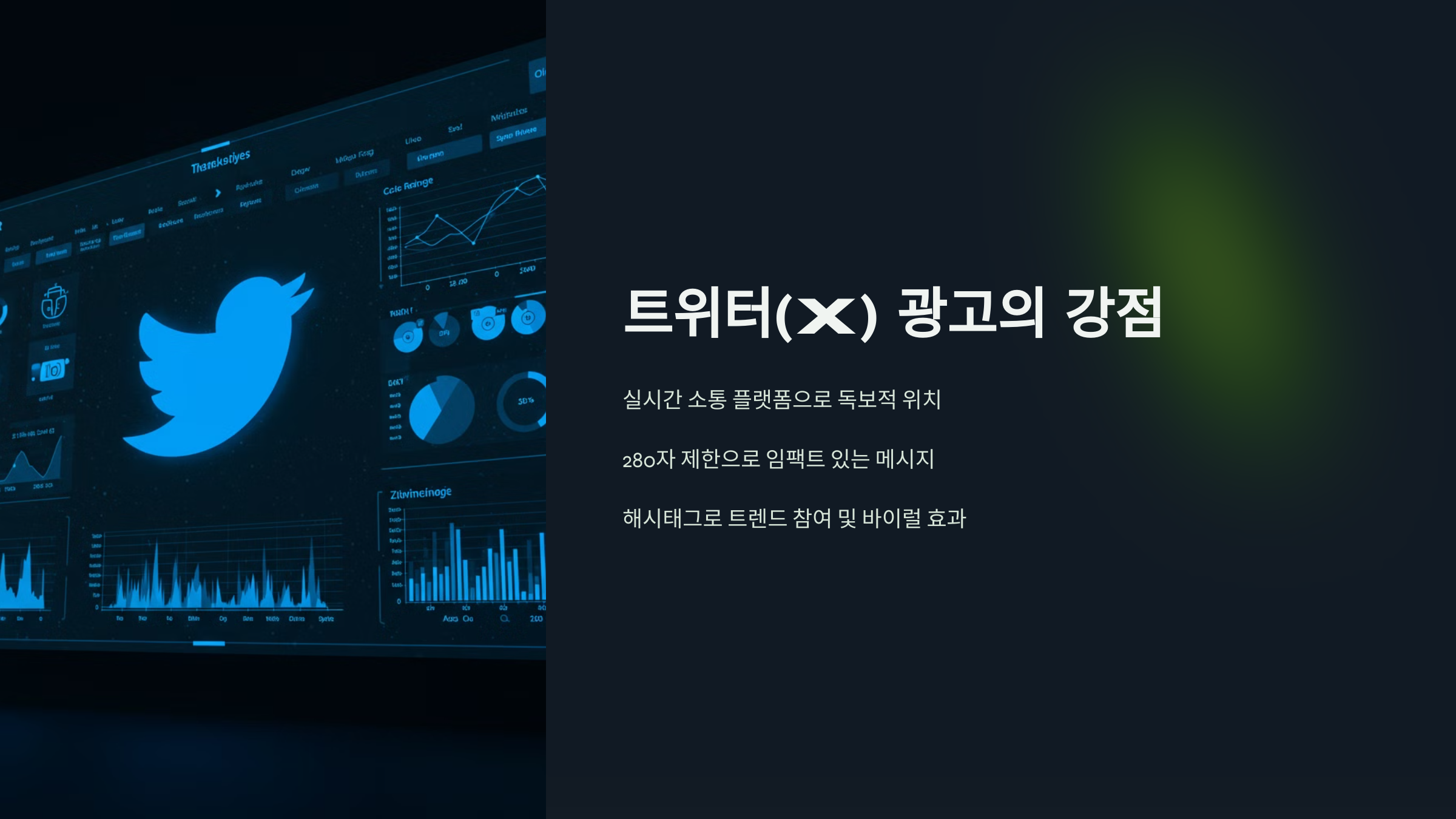 트위터(X)의 가장 큰 강점은 실시간 반응과 빠른 정보 확산입니다. 광고는 빠르게 퍼지고, 기업은 즉시 반응을 볼 수 있어, 실시간으로 광고 전략을 최적화할 수 있습니다.