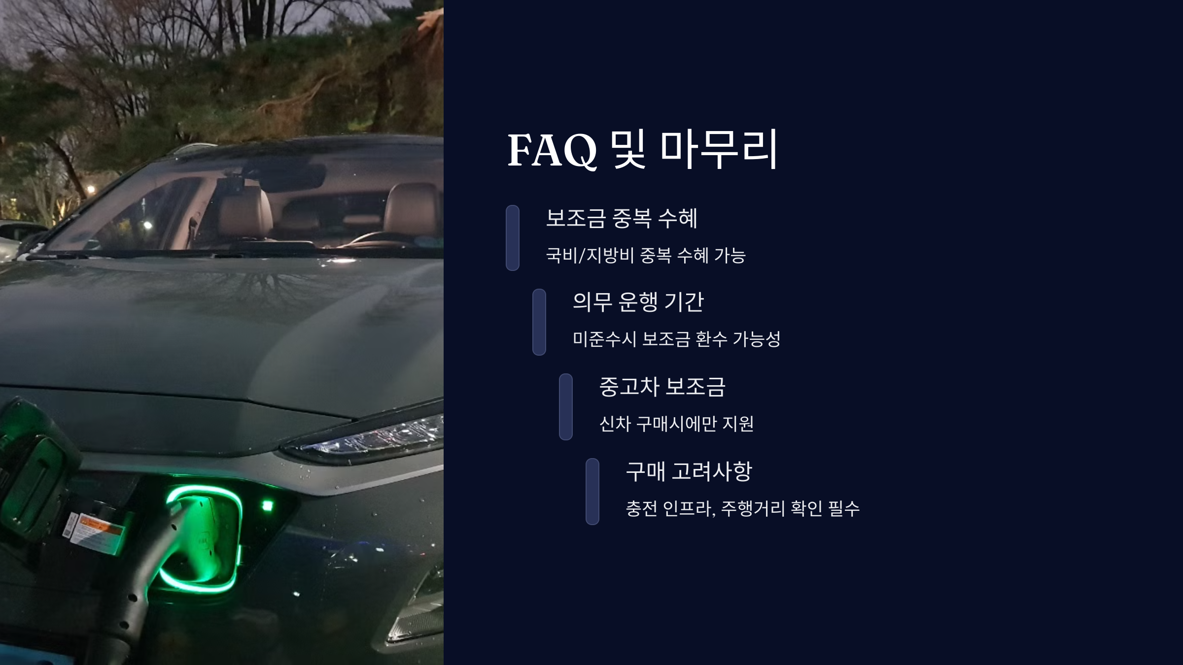 A7. 보조금을 받은 차량은 최소 2년간 보유해야 해요. 그 전에 판매하면 보조금을 반환해야 할 수도 있어요. 🚨