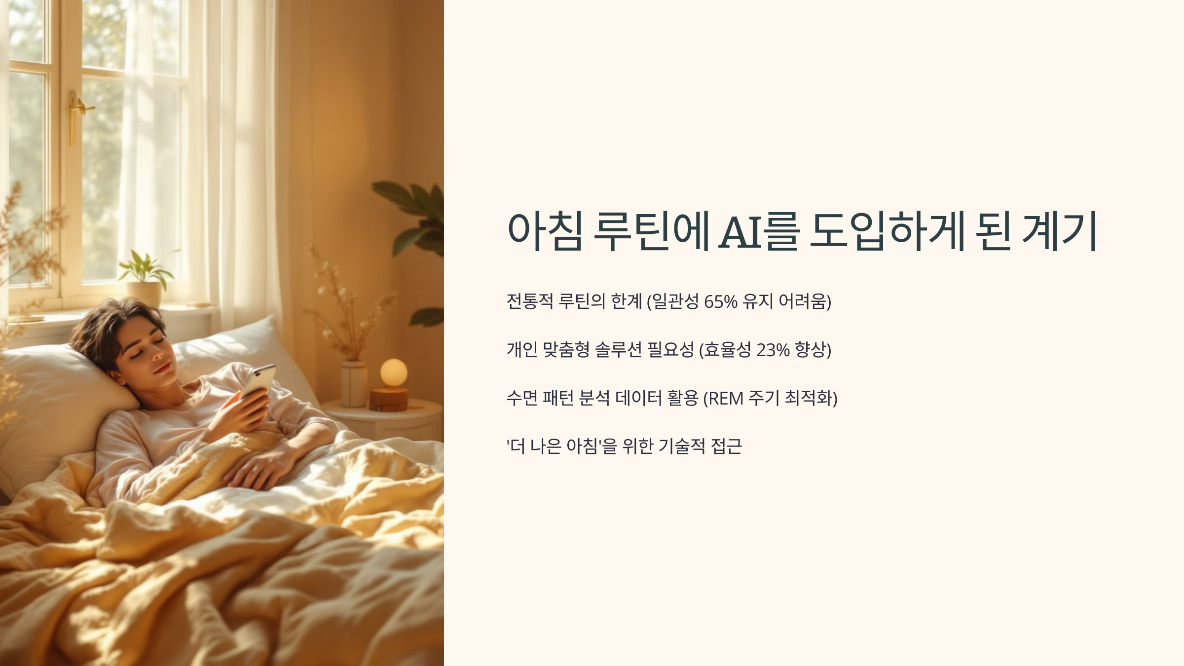 늘 그렇듯 출근 시간은 빠듯하고, 기상은 고통스러웠어요. 알람을 꺼도 다시 자고, 겨우 눈을 떠도 멍한 상태로 하루를 시작하곤 했죠. 뭔가 바꾸고 싶다는 생각은 있었지만, 방법이 마땅치 않았어요. 그러다 한 유튜브 영상에서 'AI를 활용한 아침 루틴'이라는 주제를 보고 흥미를 느끼게 됐어요.