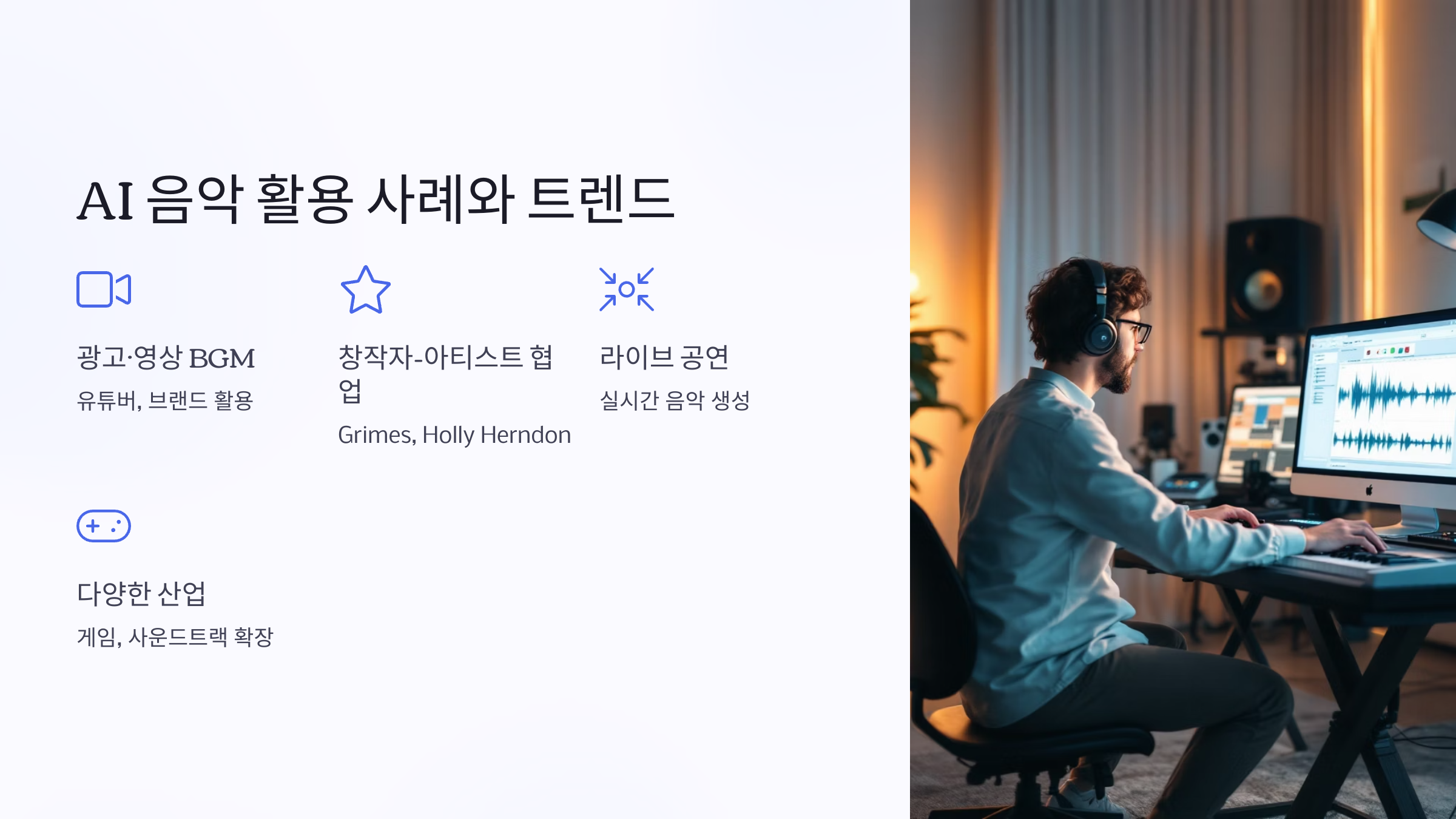 요즘은 AI 음악이 단순한 실험을 넘어서 실제 상업 콘텐츠, 음악 산업에도 적극적으로 활용되고 있어요. AI 작곡가는 디지털 크리에이터들의 파트너가 되었죠! 👩💻