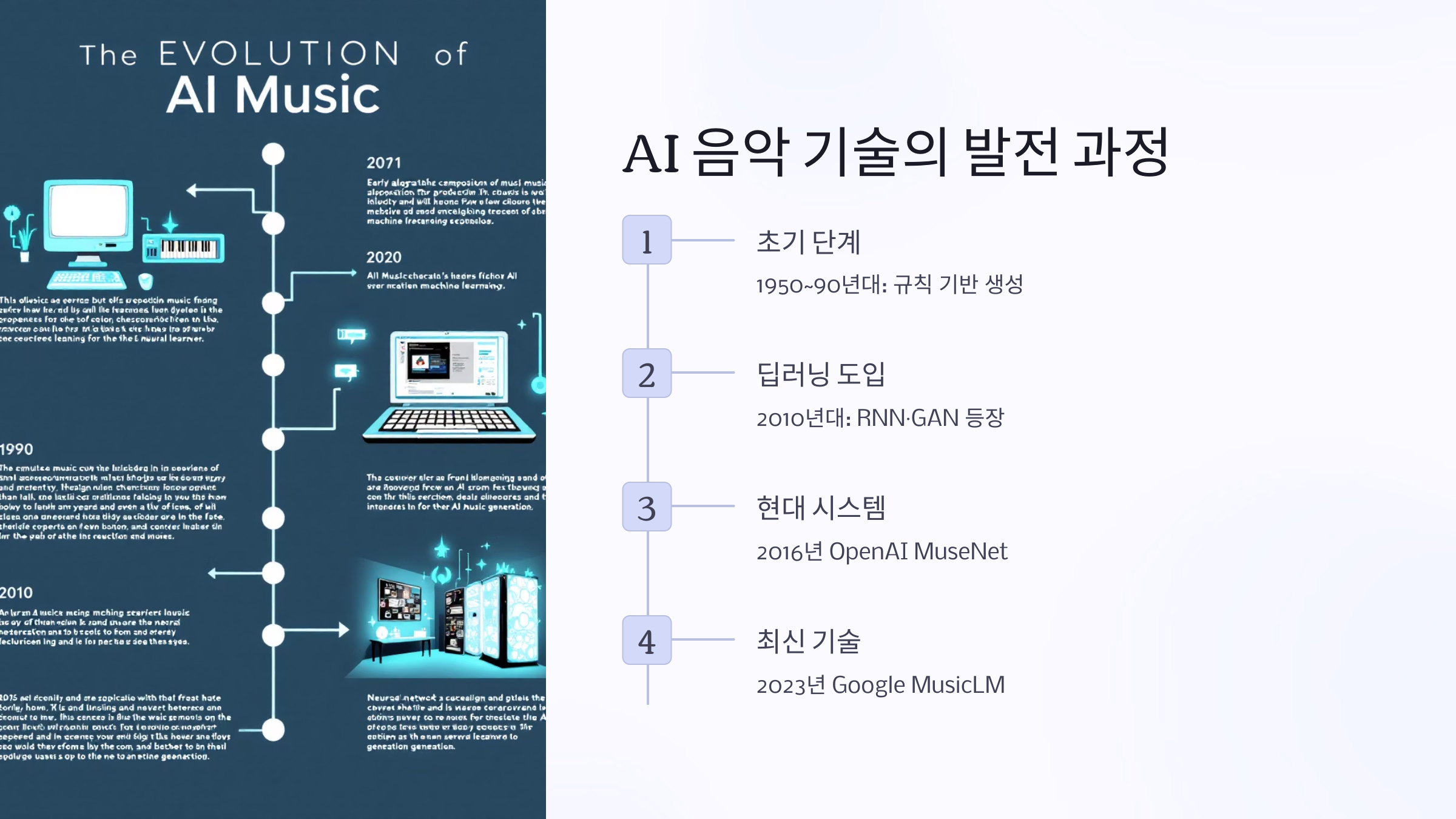 AI 음악 기술은 사실 1990년대부터 연구됐지만, 딥러닝과 GAN(생성적 적대 신경망) 기술이 도입된 2010년대 이후 폭발적인 발전을 보이기 시작했어요. 🚀