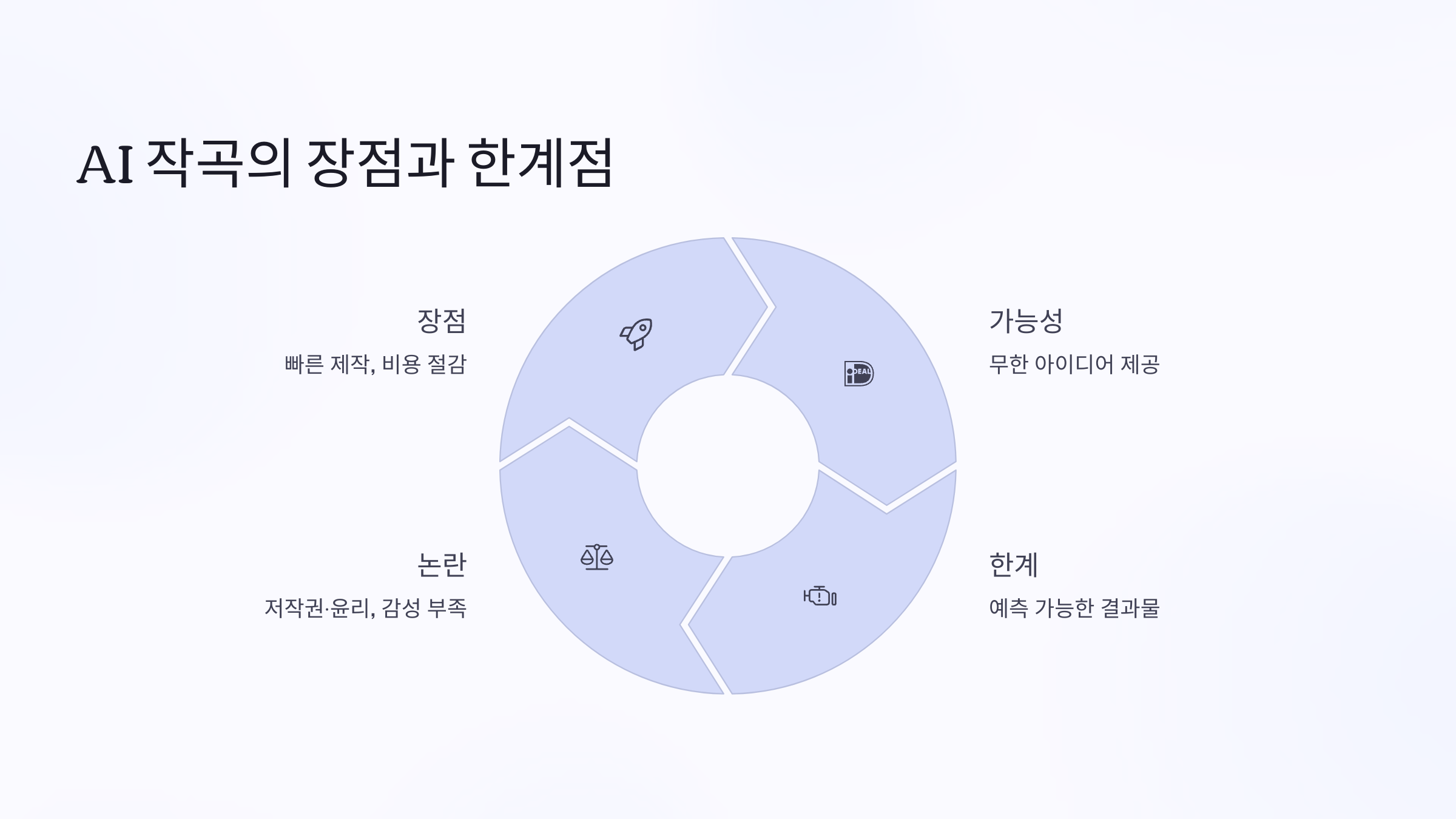 AI가 만들어내는 음악은 분명히 새로운 창작 도구예요. 사람이 하기엔 시간이 오래 걸리거나 반복적인 작업을 AI가 빠르고 정확하게 해내니까요. 🎯