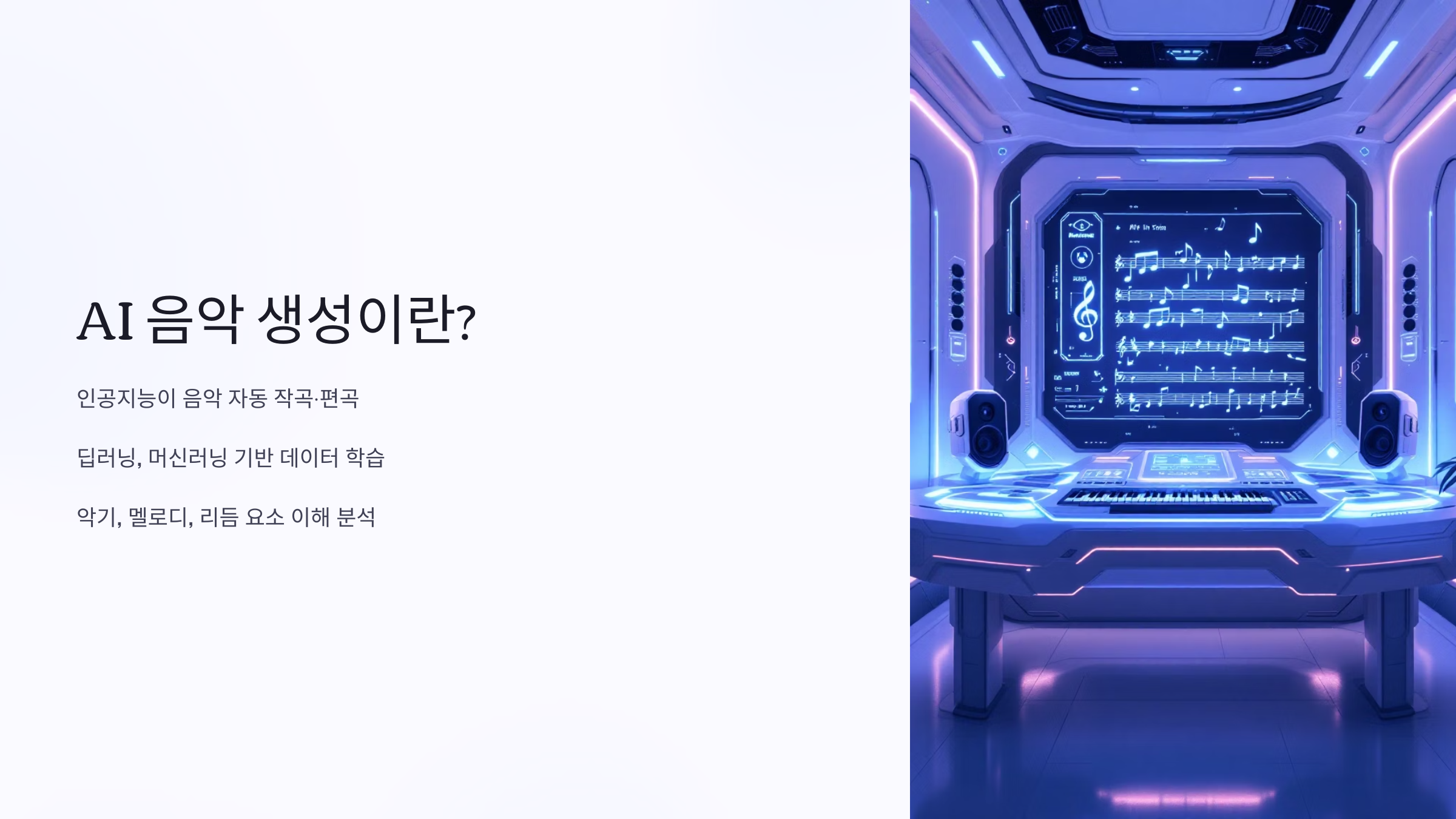 AI 음악 생성은 간단히 말해 인공지능이 사람이 만든 것처럼 음악을 작곡·편곡하는 기술이에요. 특정 음계를 따라 멜로디를 만드는 것부터 가사에 어울리는 화성, 리듬, 분위기까지 자동으로 만드는 거죠. 🤖🎶