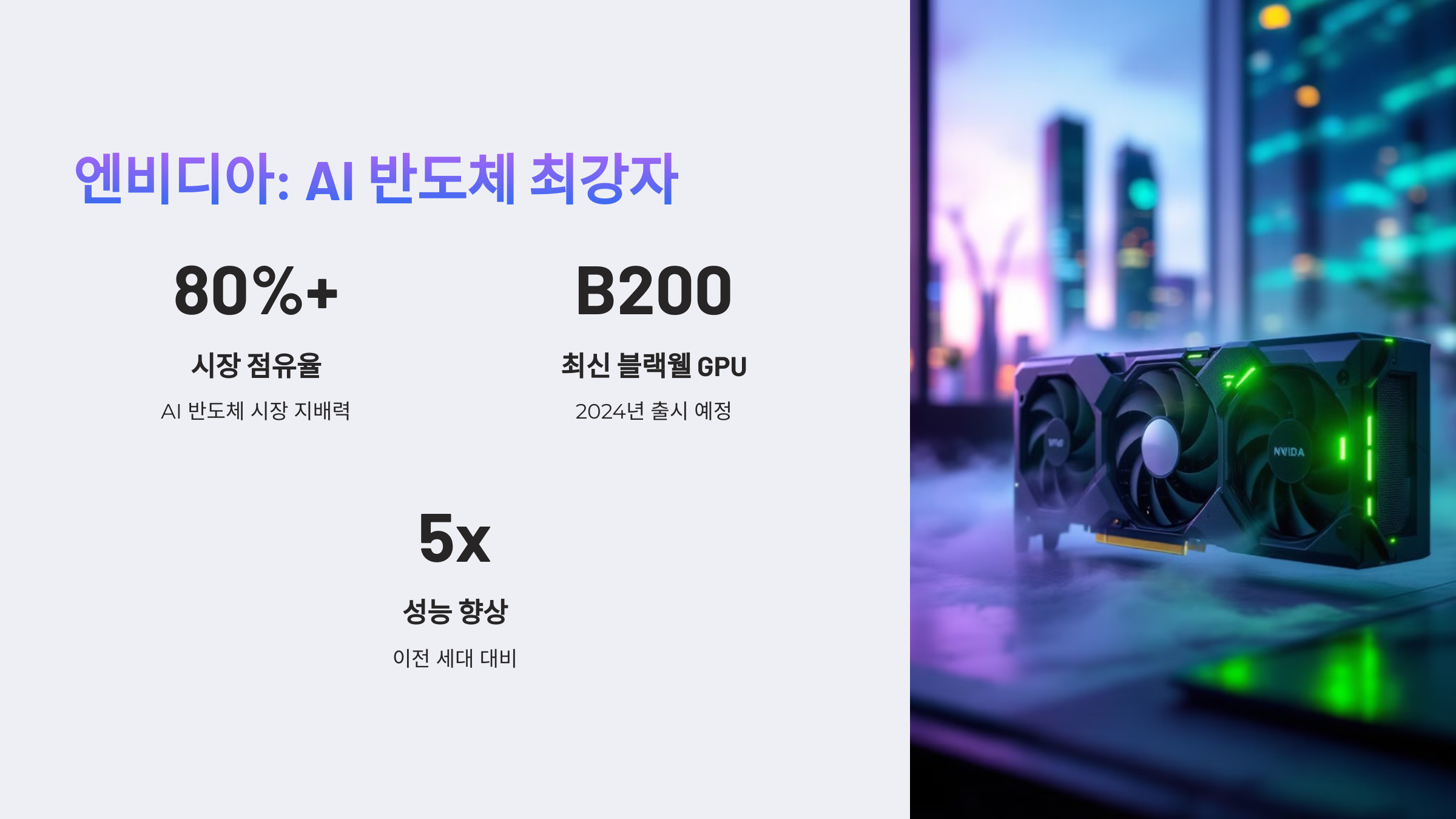 엔비디아는 AI 반도체 시장의 절대 강자예요. 특히, 데이터센터와 AI 연산을 위한 GPU(그래픽처리장치) 기술에서 독보적인 위치를 차지하고 있어요. AI 모델을 학습시키려면 막대한 연산 능력이 필요한데, 엔비디아의 GPU가 이 역할을 수행하죠.