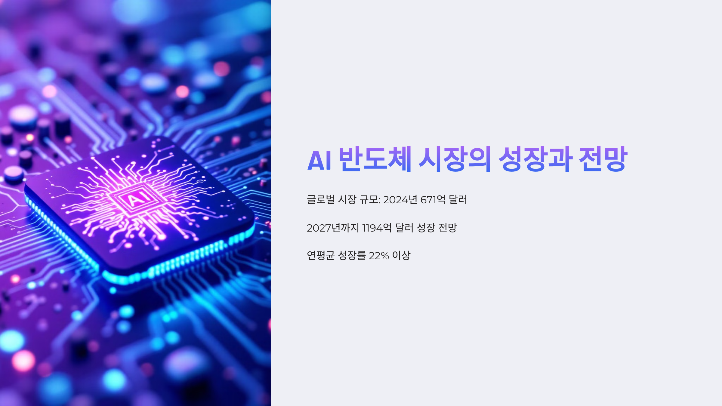 AI 반도체 시장이 폭발적으로 성장하고 있어요. 인공지능(AI) 기술이 빠르게 발전하면서 AI 연산을 최적화한 반도체의 수요가 급증하고 있죠. 기존의 중앙처리장치(CPU)보다 더 빠르고 효율적인 AI 칩이 필수적인 시대가 된 거예요.