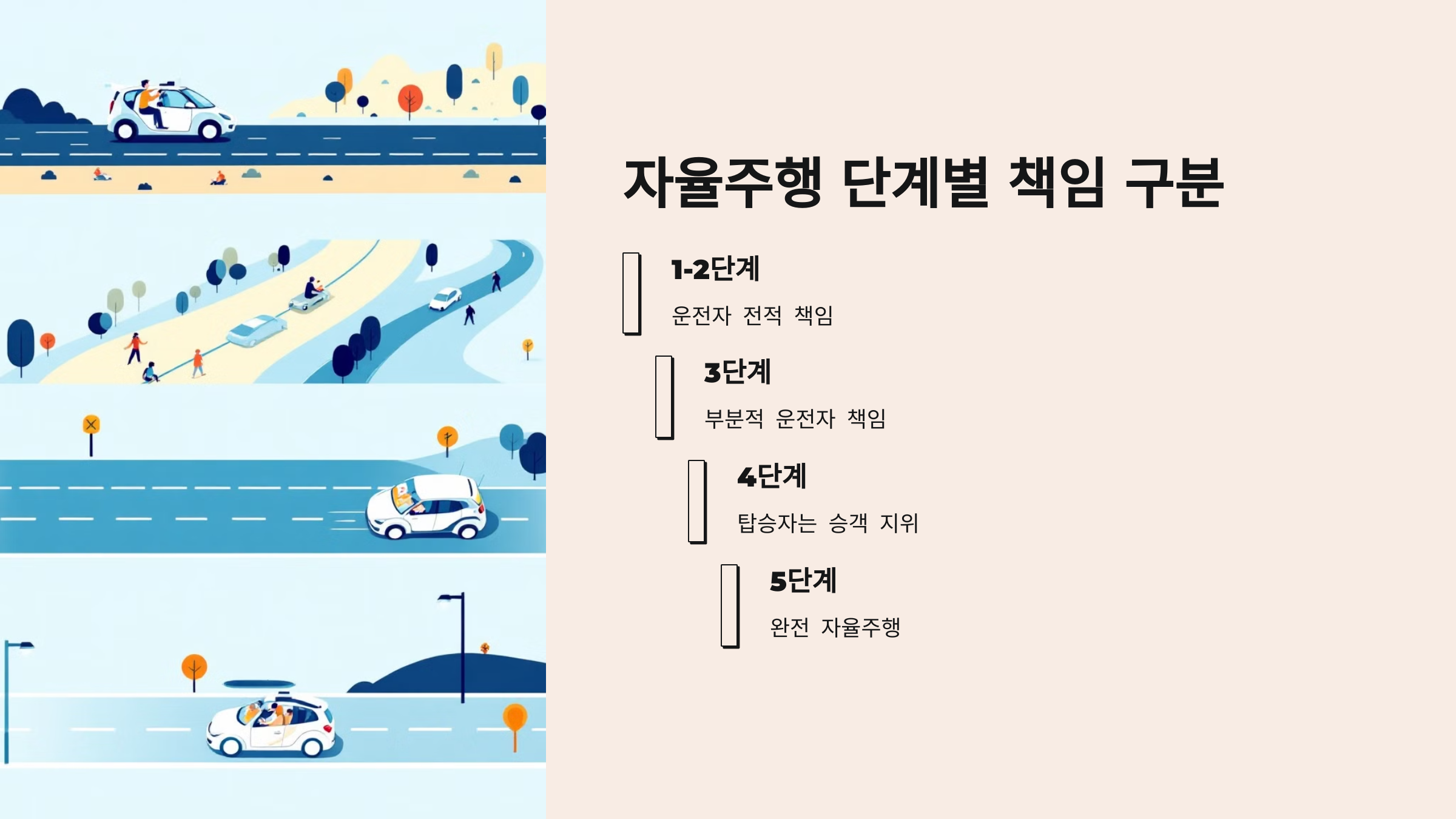예를 들어, 레벨 0~2는 운전자가 대부분의 조작을 해야 하기 때문에 사고가 나면 일반적인 교통사고와 마찬가지로 운전자 과실 책임이 커요. 하지만 레벨 3 이상부터는 차량이 스스로 판단해 조향이나 가감속을 조절하므로 상황이 복잡해져요.