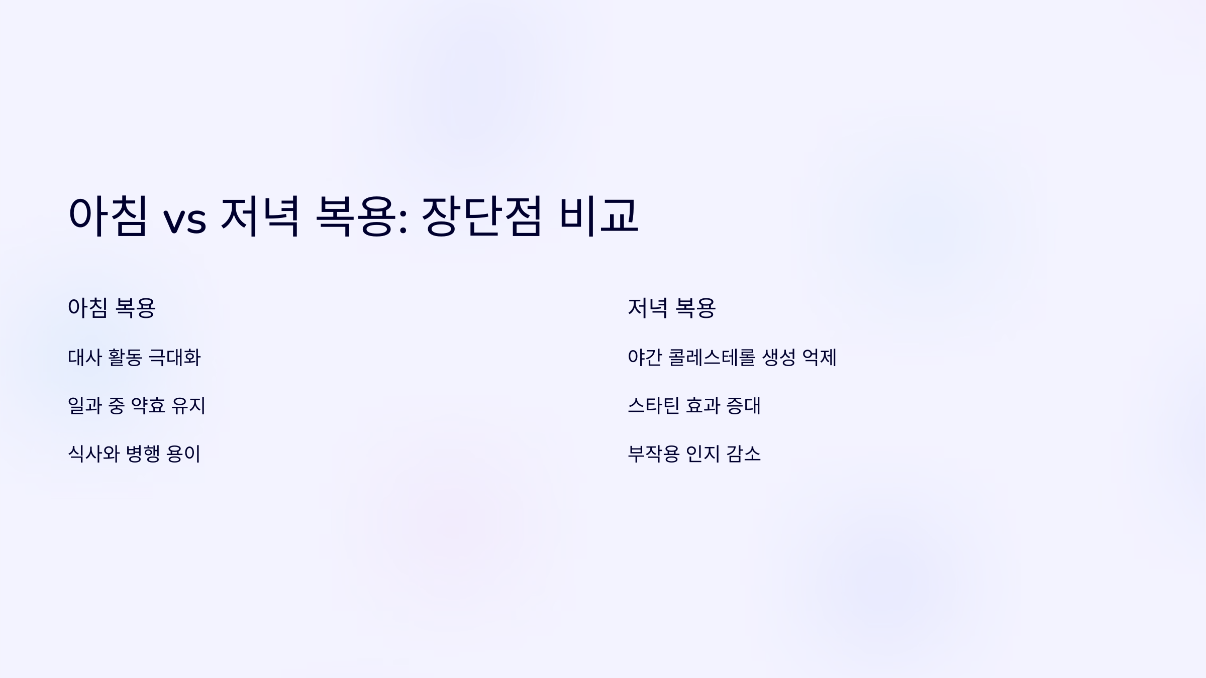 아침 복용의 장점은 복용을 잊지 않기 쉬운 점이에요. 아침 루틴에 포함시키면 꾸준한 복용 습관을 들이기 좋아요. 저녁 복용은 간 기능이 콜레스테롤을 더 많이 합성하는 시간과 맞물리기 때문에 효과적인 경우가 많아요.