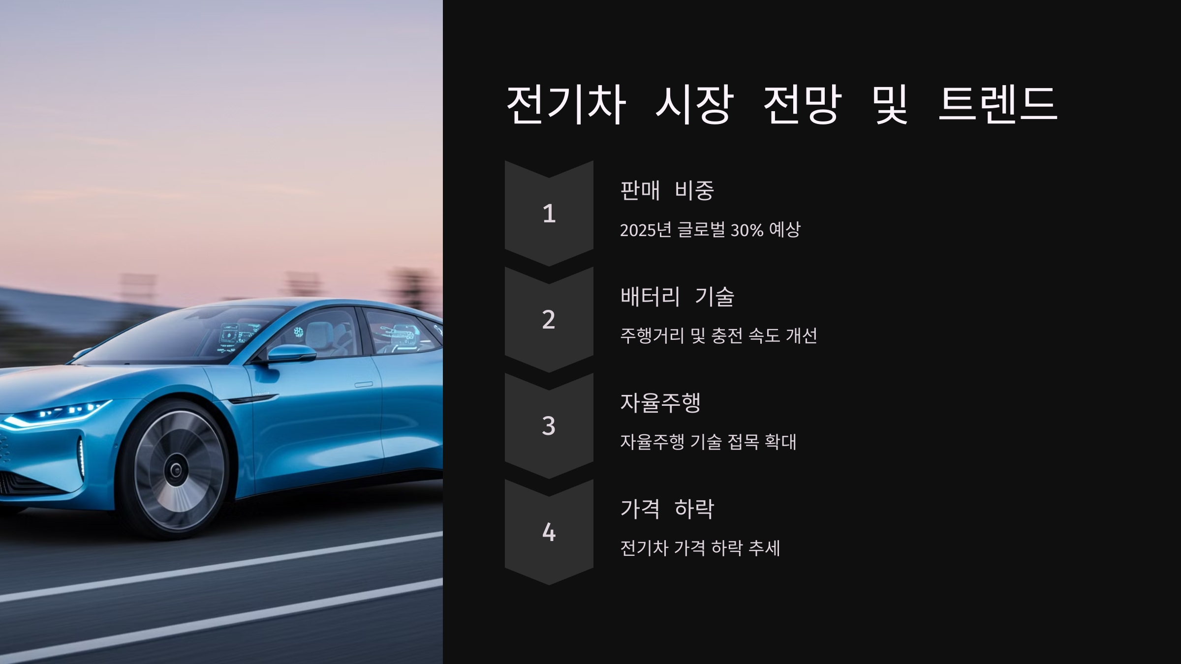 | 전기차 평균 가격 | 5,500만 원 | 4,800만 원 | 배터리 가격 하락 |