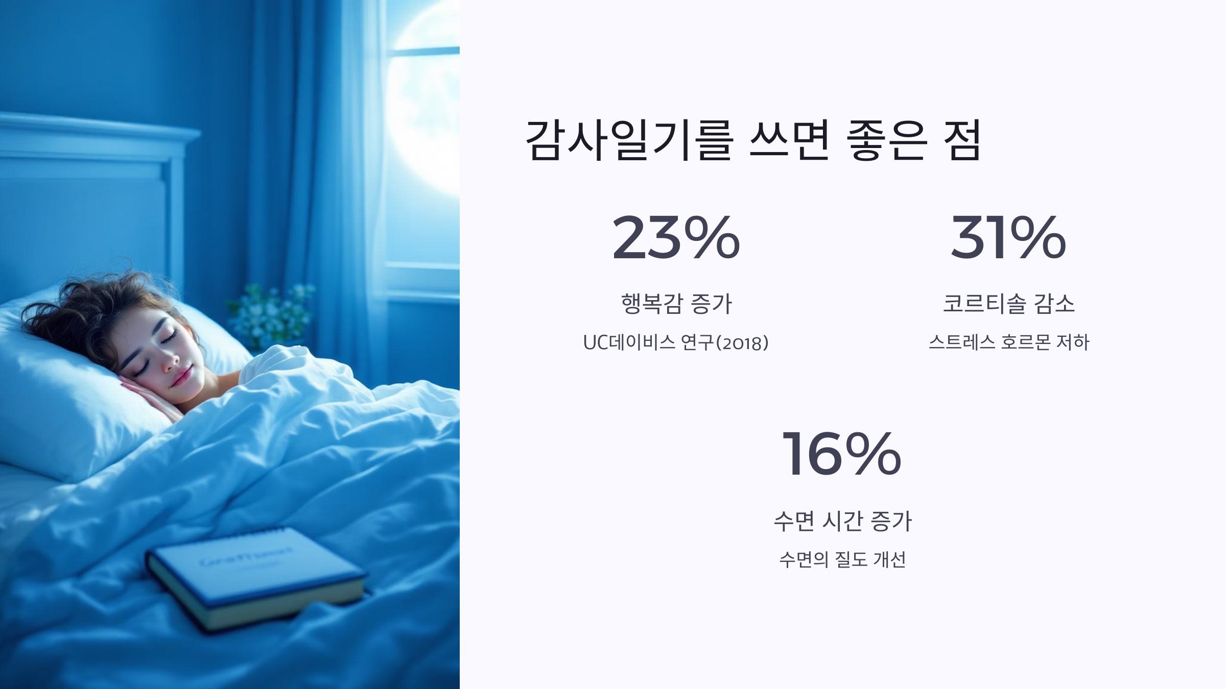 미국 UC데이비스의 심리학 연구에 따르면, 하루 한 줄 감사일기를 3주 동안만 써도 신체 면역력이 높아지고 수면의 질도 향상된다고 해요. 감사는 단순한 감정이 아니라 몸과 마음을 건강하게 만드는 습관이랍니다.🛌