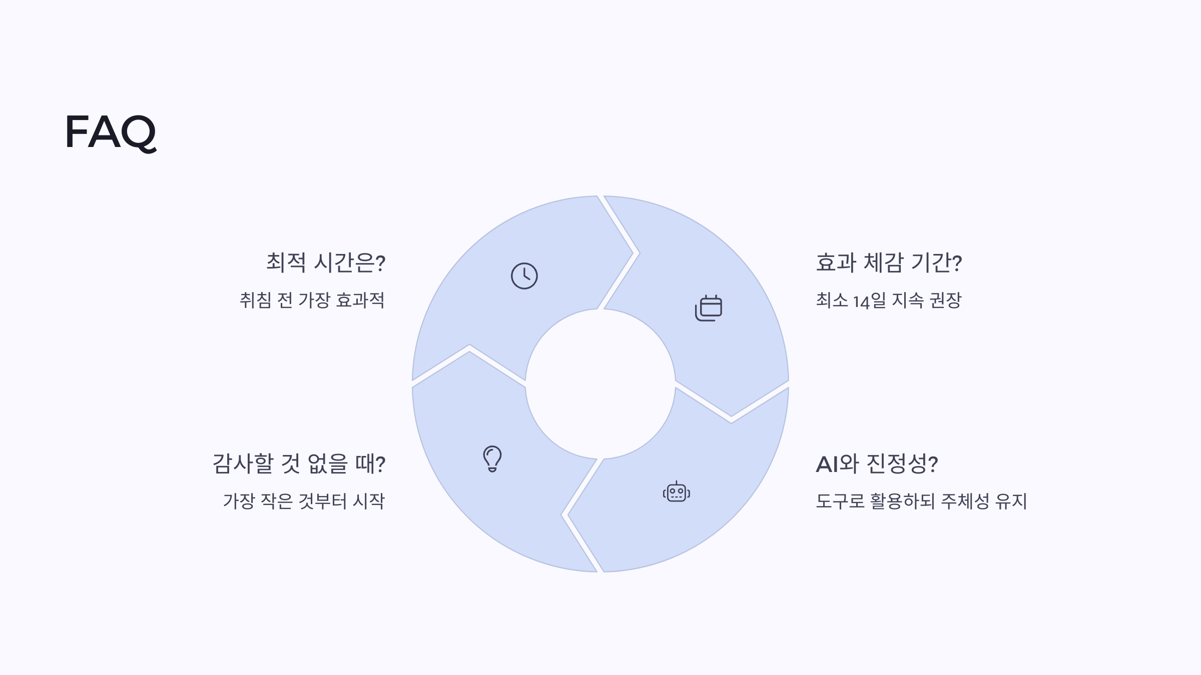 예를 들면, 양치 후, 침대에 눕기 전, 커피 마시기 전 등 일상에서 반복되는 행동과 연결시키는 거예요. 습관은 자극 → 행동 → 보상의 반복으로 형성되기 때문에 감사일기를 특정 행동과 묶어두면 자연스럽게 떠오르기 시작해요.