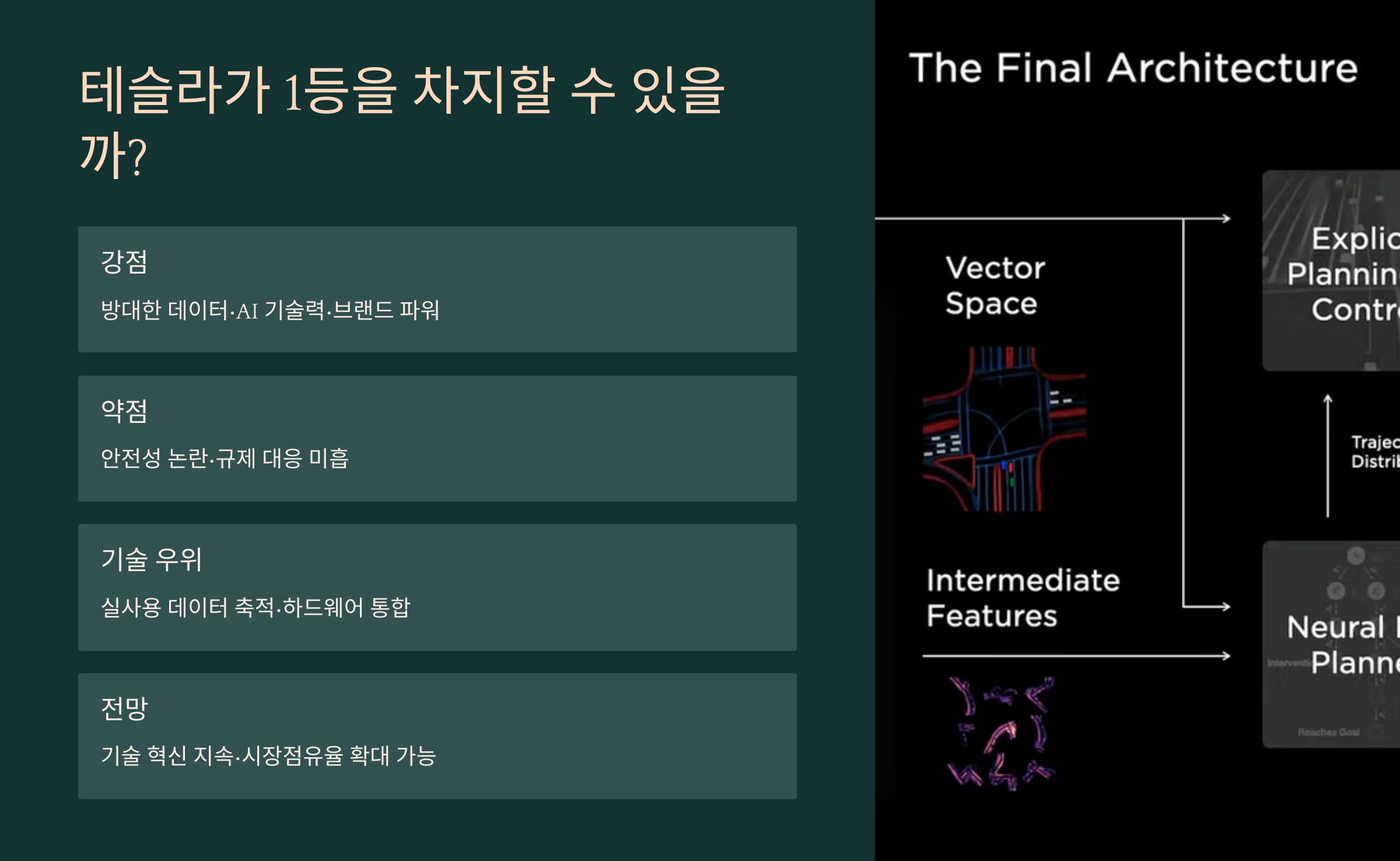 테슬라는 엄청난 양의 데이터를 바탕으로 AI를 학습시키고 있지만, 웨이모나 크루즈처럼 레벨 4 자율주행을 실제로 운영하지는 못하고 있어요. 즉, 기술적으로는 아직 1위라고 보기 어려울 수도 있어요. 🏁
