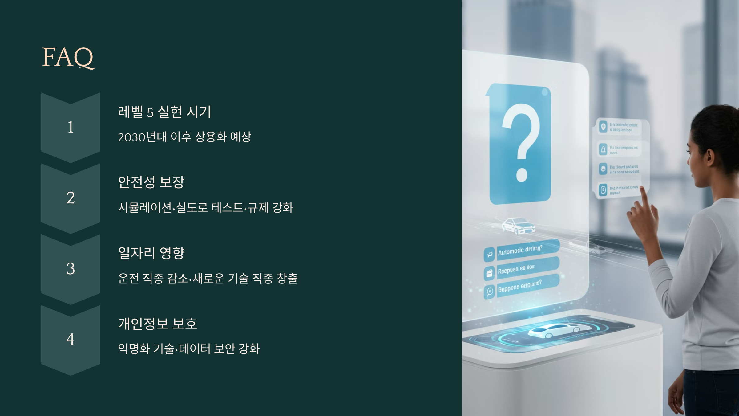 A5. 자율주행이 발전하더라도 초기에는 운전자 개입이 필요한 하이브리드 형태로 운영될 가능성이 높아요. 완전 무인차가 일반화되려면 시간이 걸릴 것으로 보입니다. ⏳