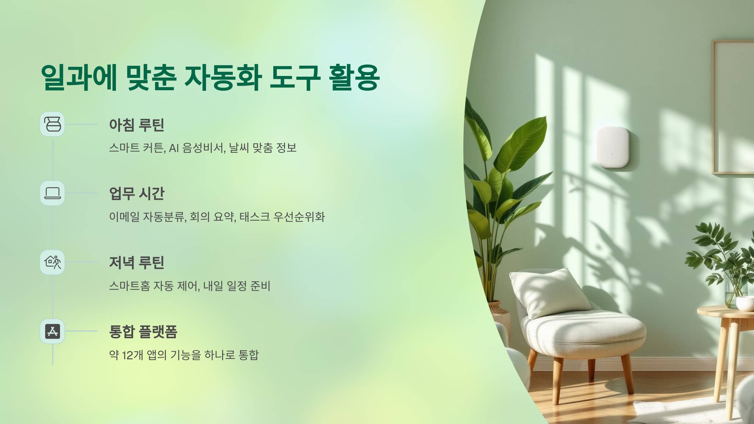예를 들어, 기상 시간에 맞춰 자동으로 커튼이 열리고, AI가 추천한 음악이 재생되며, 오늘 일정과 날씨가 자동으로 안내되는 것. 이런 작지만 반복적인 자동화가 삶 전체의 리듬을 안정시키는 효과가 있어요.