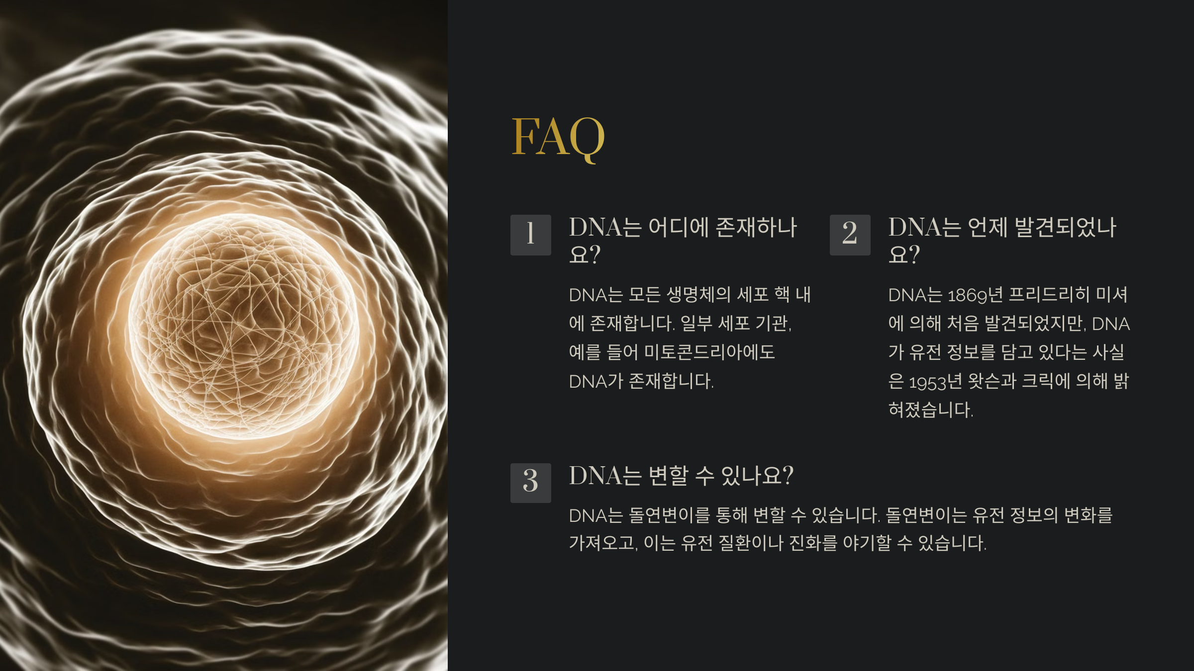A7. DNA는 안정성이 높은 분자지만, 높은 열이나 극한 조건에서는 분해될 수 있어요. 이를 보완하기 위해 세포는 여러 복구 메커니즘을 가지고 있어요.