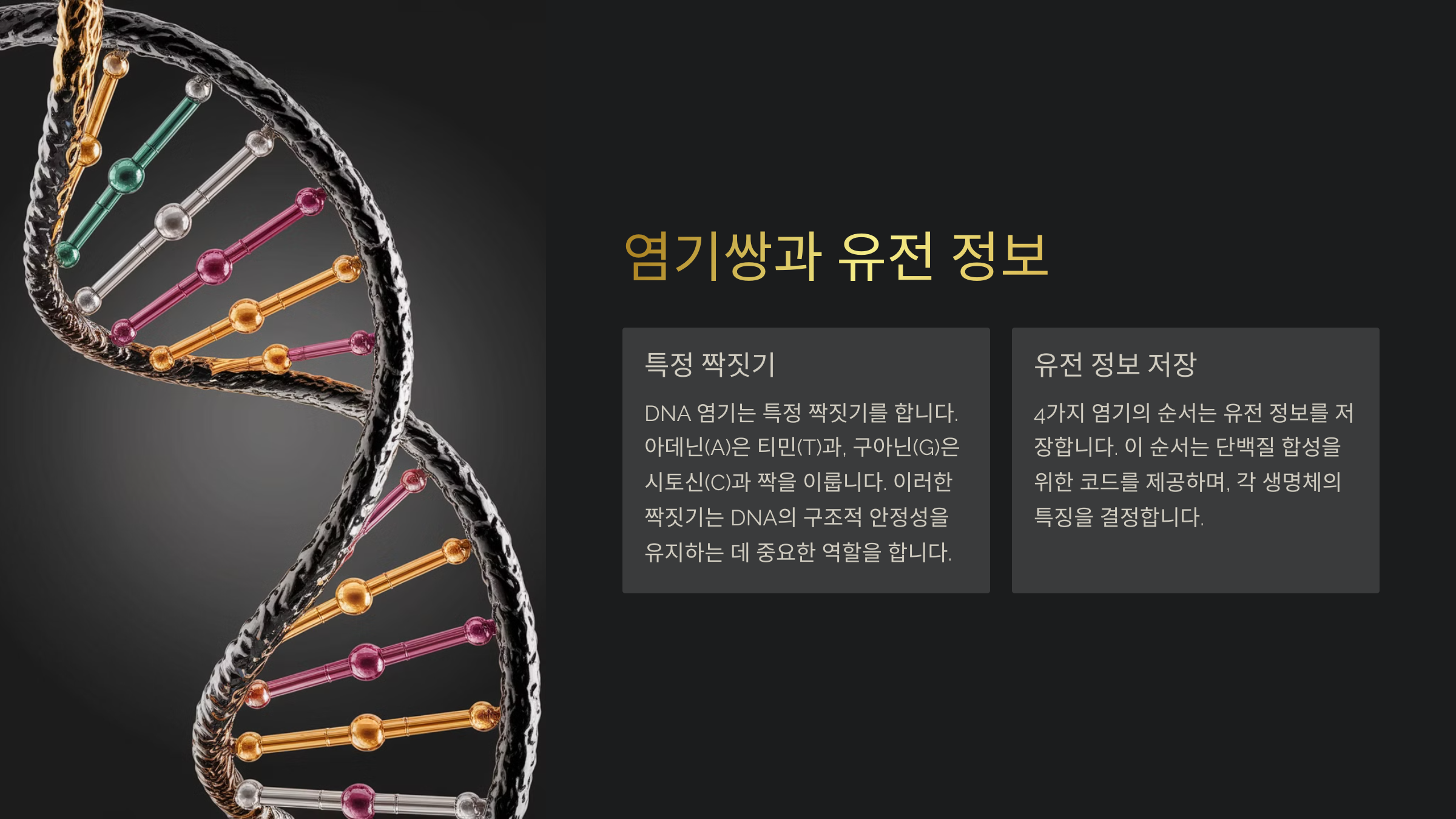 염기쌍은 DNA의 진정한 정보 저장소라고 할 수 있어요. 이중 나선의 내부에 위치한 질소 염기들은 수소 결합을 통해 서로 짝을 이루고, 그 결과 염기쌍이 형성돼요. 아데닌(A)은 티민(T)과, 구아닌(G)은 시토신(C)과 결합해 매우 안정적인 이중 나선을 유지해요.