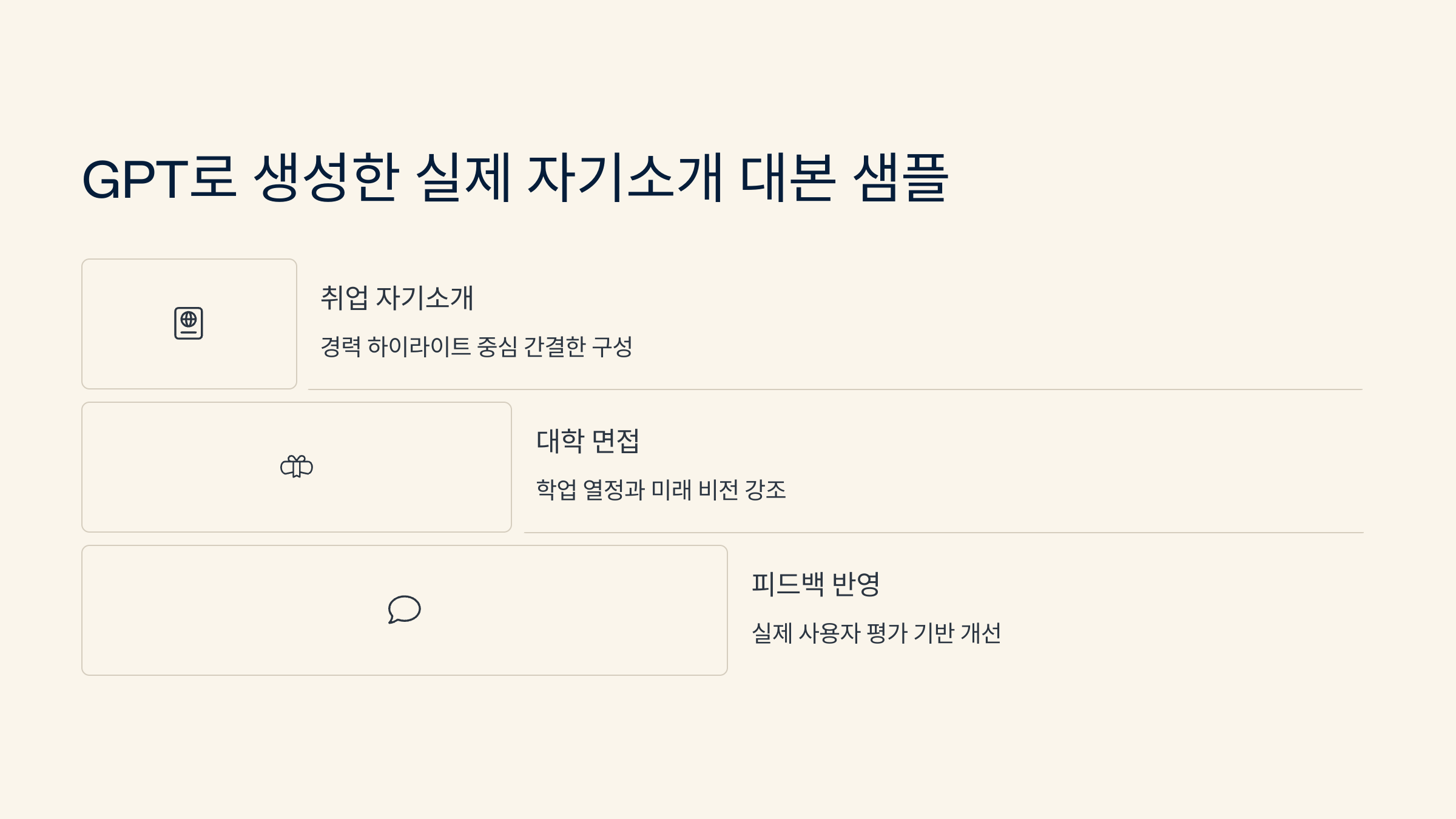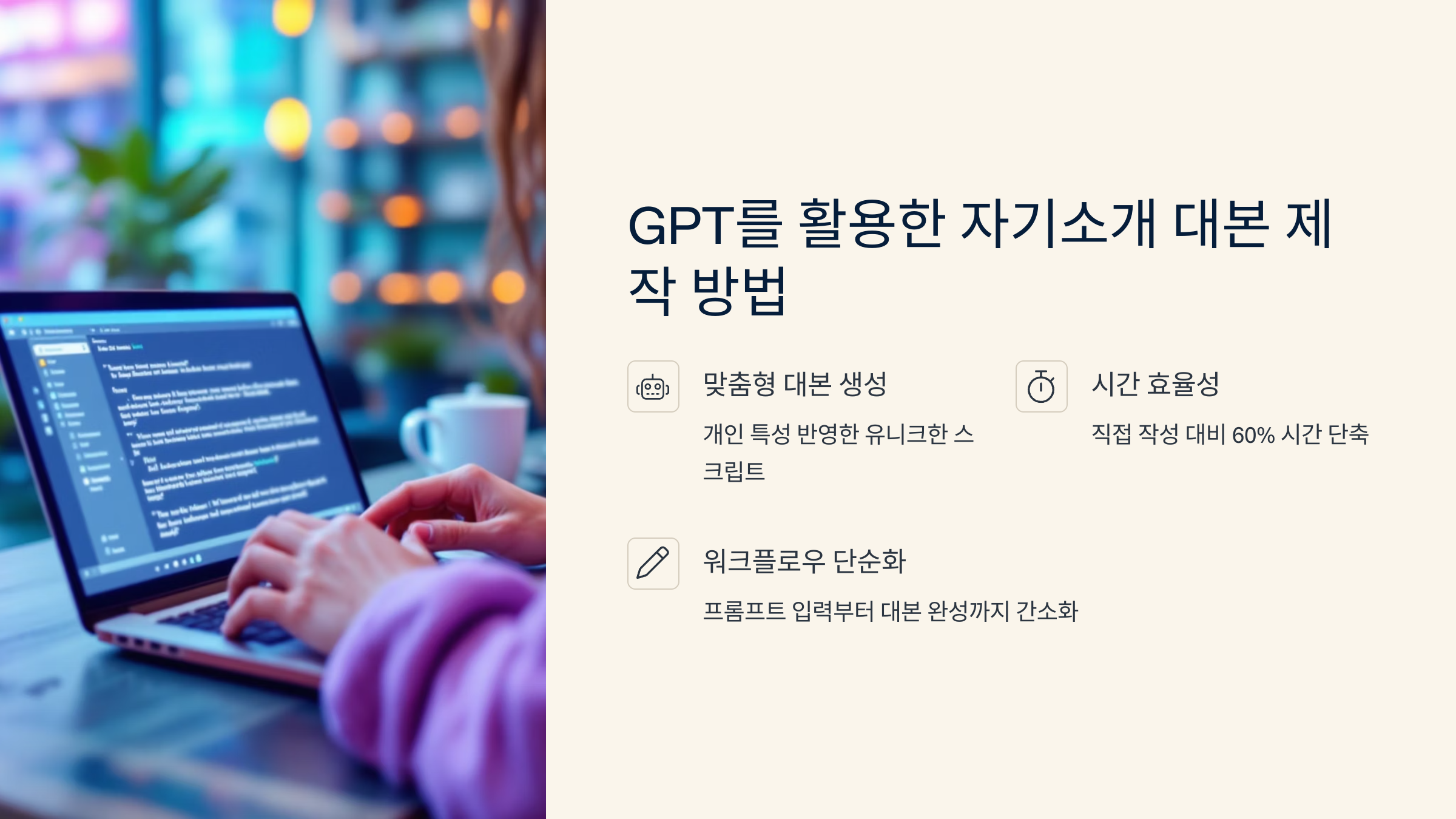 이 모든 걸 GPT에게 맡기면, 말투도 자연스럽고 길이도 적절한 대본을 쉽게 만들 수 있어요. 몇 가지 정보만 넣으면 바로 완성되니까요.