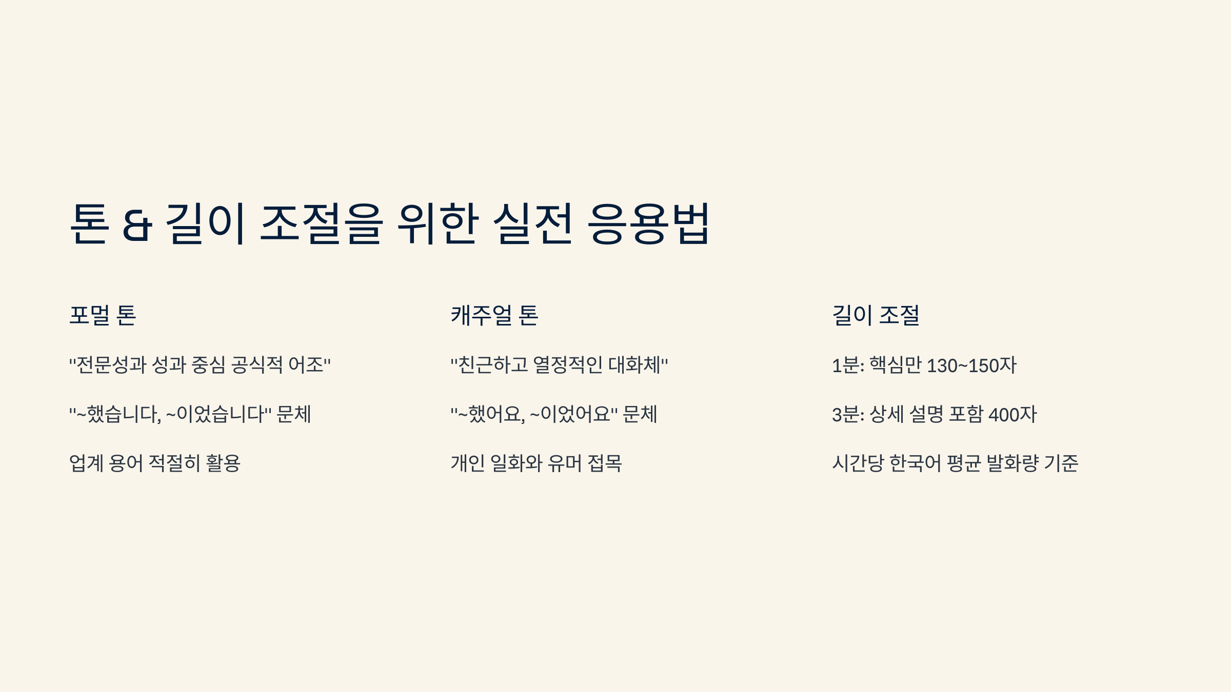 GPT로 대본을 만들 때, 말투와 길이를 조금만 바꿔줘도 완전히 다른 인상을 줄 수 있어요. 같은 내용이라도 캐주얼하게 말하면 친근하고, 정중하게 말하면 신뢰감이 생기죠.
